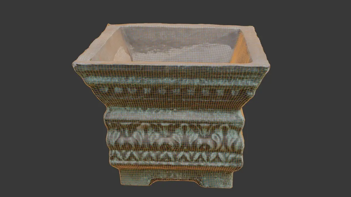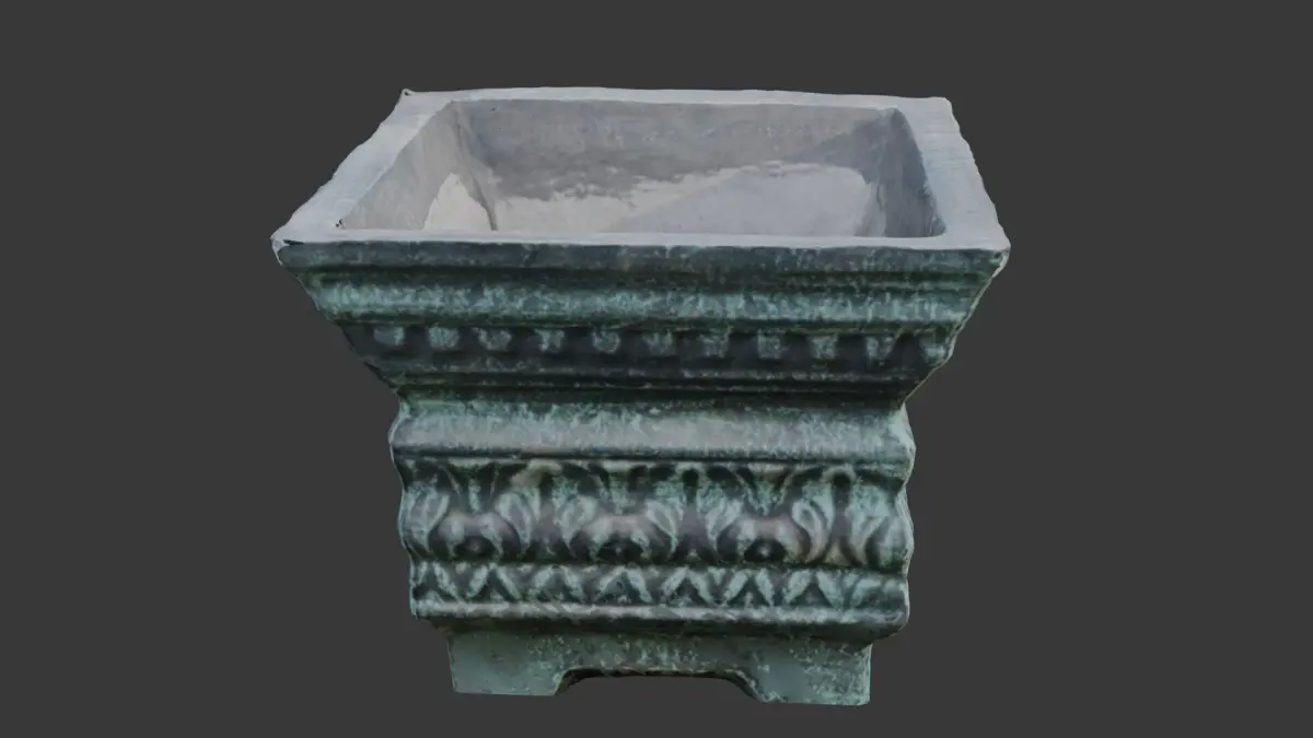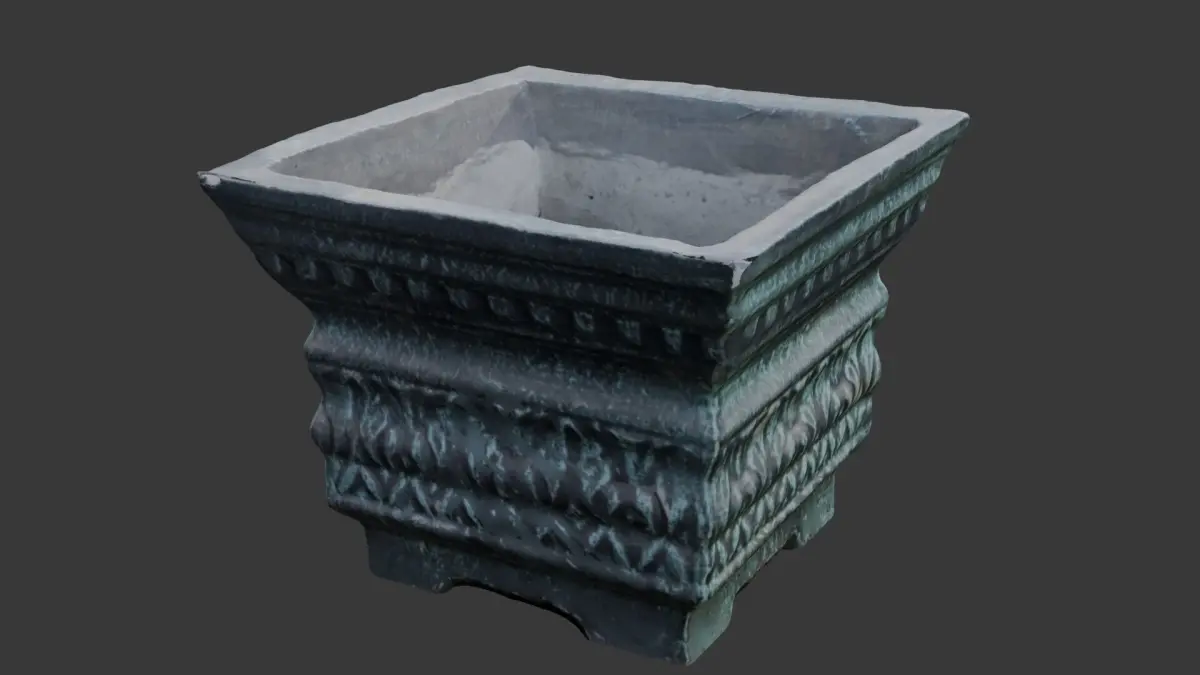 Highly detailed 3D scan of an ornate stone planter with intricate decorative carvings and a weathered patina. Perfect for architectural visualization, historical reconstructions, garden scene rendering, and game environments. The model captures realistic surface details, including chipped edges, aged textures, and natural material imperfections.