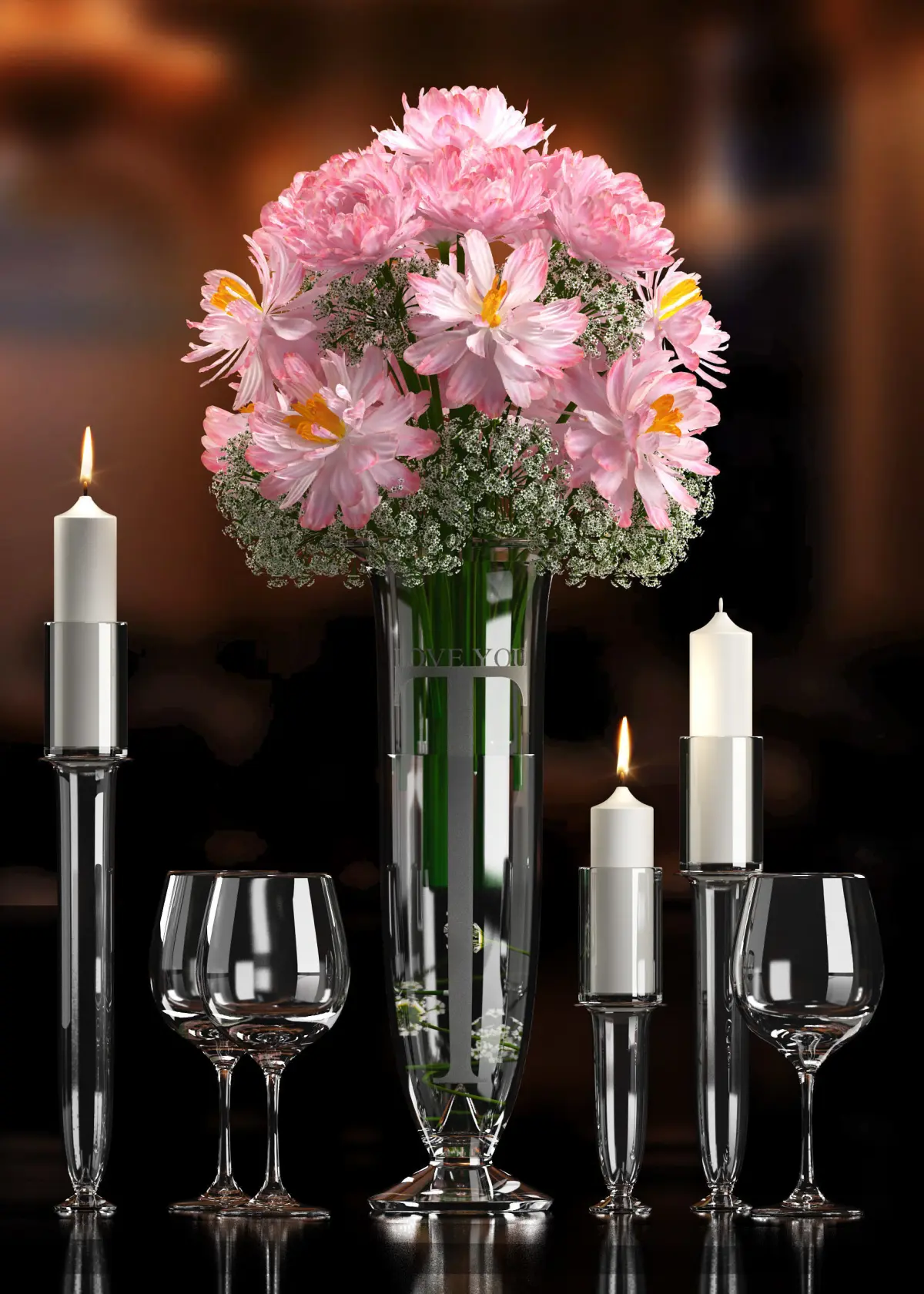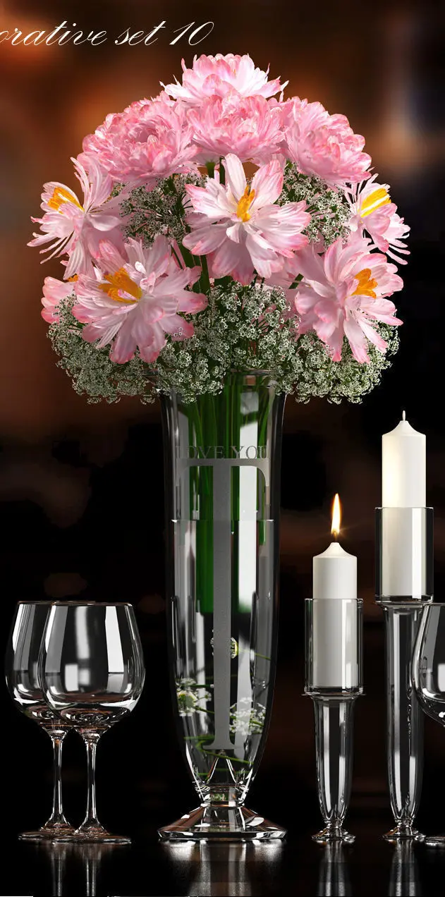 DECORATIVE FLOWER VASE SET 10 CONTAINS A LONG GLASS VASE WITH PINK POPPIES WITH SMALL WHITE FLOWER BUNCH, ADDED GLASS CANDLES HOLDERS AND WINEGLASSES OVERALL A COMPLETE PACKAGE FOR A TABLEWARE, designed in 3dsmax