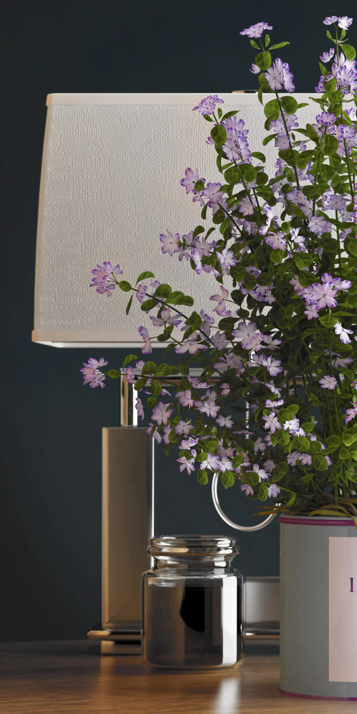 decorative vase set 15 contains a bunch of purple flowers in a vase with a bed lamp and a glass cup makes an perfect tableware for your interior, designed in 3dsmax