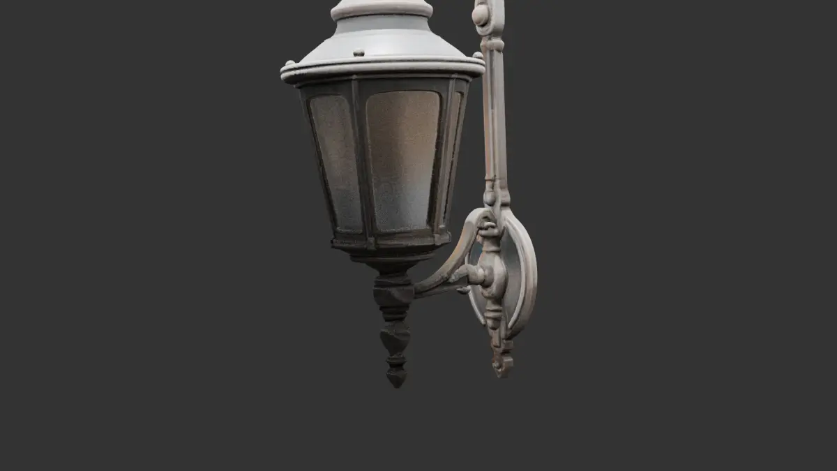 A wall-mounted lamp with a wrought iron frame and frosted glass cover. The lamp has an antique design and includes modeled bolts and a mounting bracket. It’s great for castle interiors, fantasy corridors, or moody dungeons. The lamp is unlit but features soot marks and patina to enhance its realism. It blends into both realistic and fantasy settings where ambient wall lighting is needed.