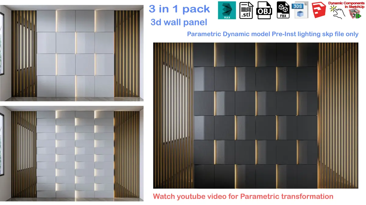 Models Details .Model : 1Model type : DynamicFully parametric : yesArray Option : yesRender engine : EnscapeMaterial Enscape : yesPre-Installed Lighting : yesAny size able : yesSketchup Version : 2020Exchange Formats : 3Ds Max 2020, OBJ, FBX, Dae, 3ds, stl. IncludedWatch You tube video Tutorial for this model how to use: youtu.be/SXYOmU6WBgMLooking to add a touch of elegance and sophistication to your living room and bedroom walls? Look no further! Welcome to our captivating video showcasing a wide range of decorative wall panels in mesmerizing 3D models specifically designed to transform your living spaces.In this video, we take you on a visual journey through an array of exquisite decorative wall panels, meticulously crafted to enhance the ambiance of your home. From contemporary geometric patterns to intricate floral designs, these 3D models offer a perfect blend of artistic beauty and functionality. Witness the transformative power of these panels as they add depth, texture, and a unique focal point to your living room and bedroom walls. With their stunning visual appeal, these decorative wall panels create an inviting atmosphere that reflects your personal style and taste. We also provide expert tips on how to incorporate these decorative wall panels into your home decor, guiding you through the installation process to ensure a seamless and hassle-free experience. Discover the versatility of these panels as we explore various design options and demonstrate how they effortlessly complement different interior styles.Subscribe now to our channel and hit the notification bell to stay updated with the latest trends in home decor. Get inspired by the captivating beauty of decorative wall panels and embark on a journey to transform your living spaces into luxurious and inviting retreats.