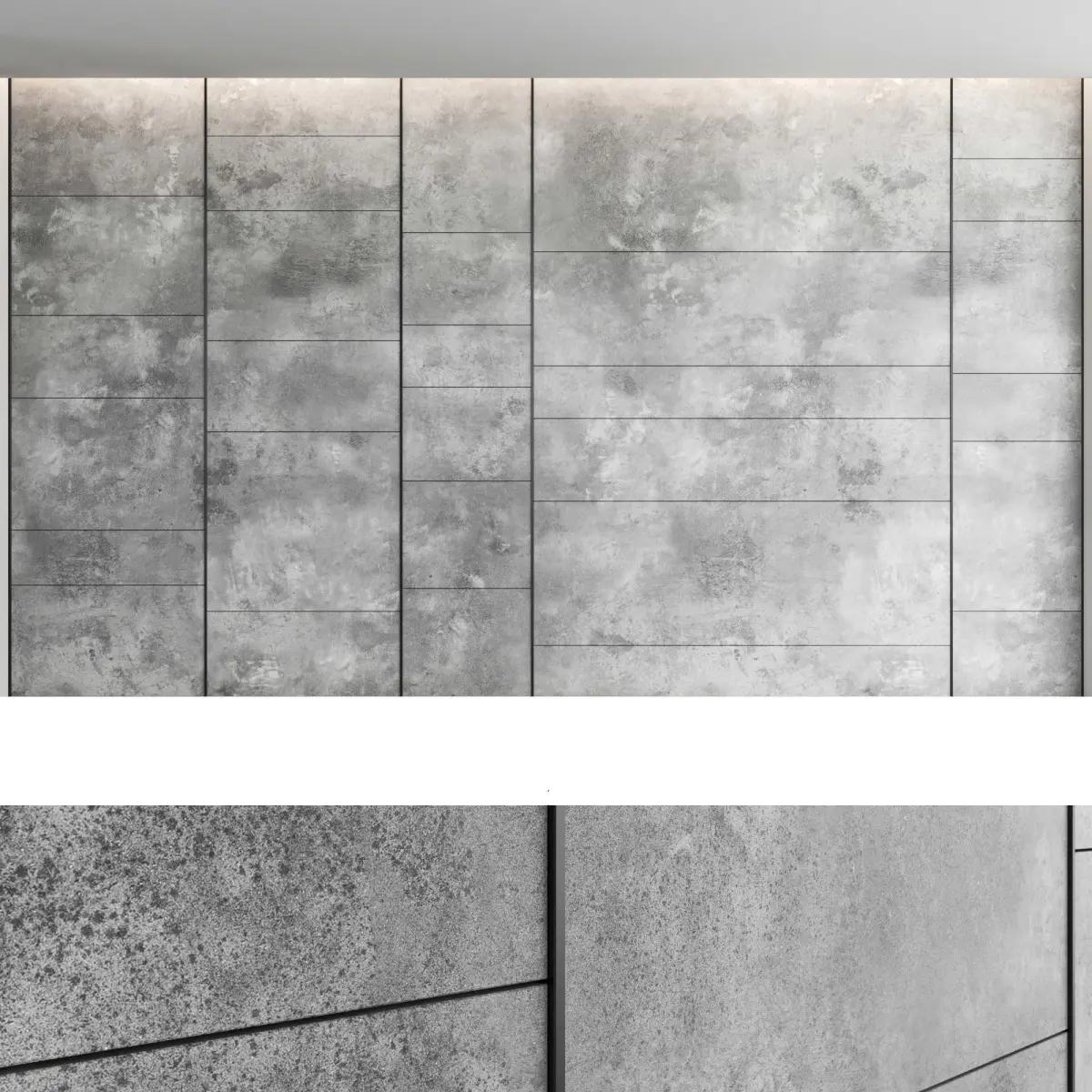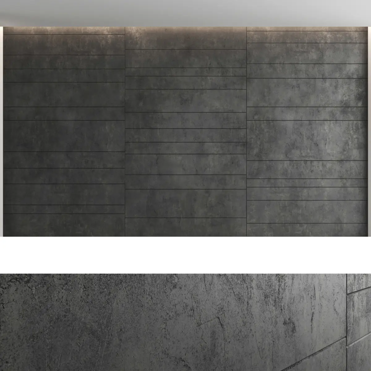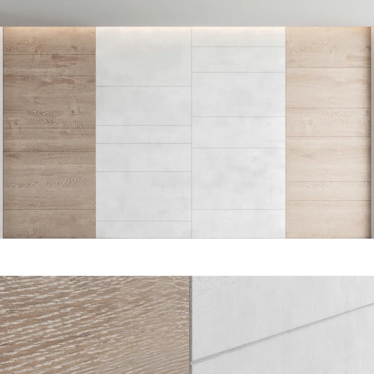 Headboard and wall panel4 types of configuration4 materials of decorative concrete (seamless high-quality textures, resolution 8000x8000 pixels)1 wood material (high resolution seamless oak textures, 8000x6000 pixels)1 metal (brass)Blades size: W.5000mm x H.3000mm