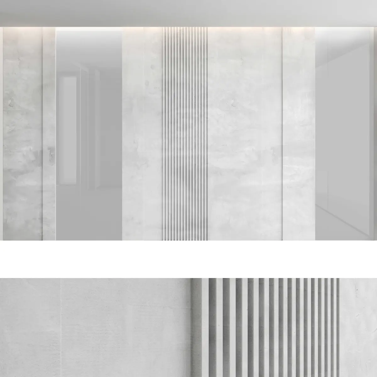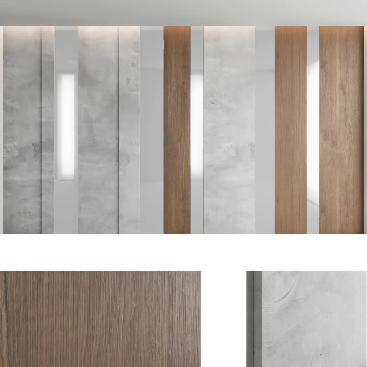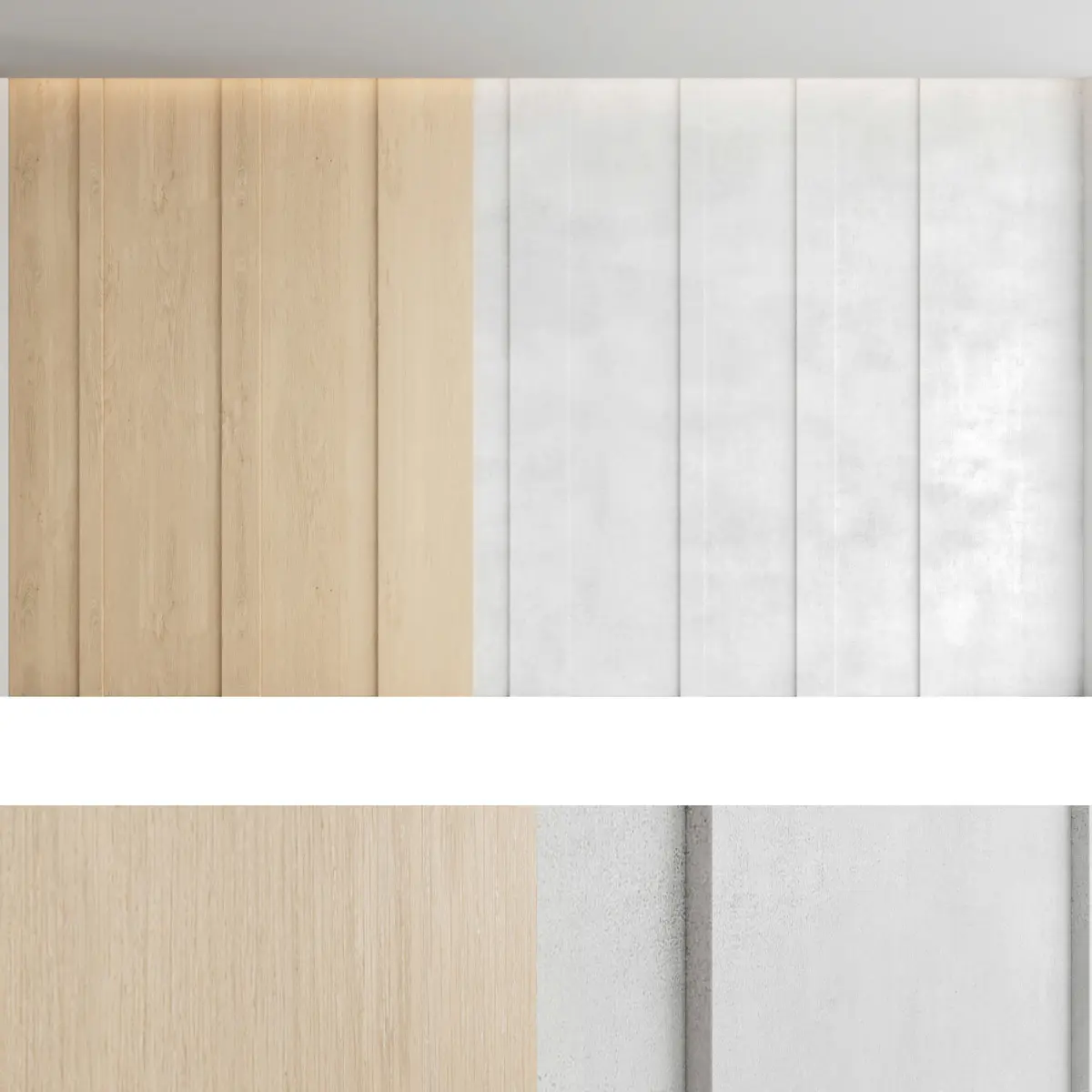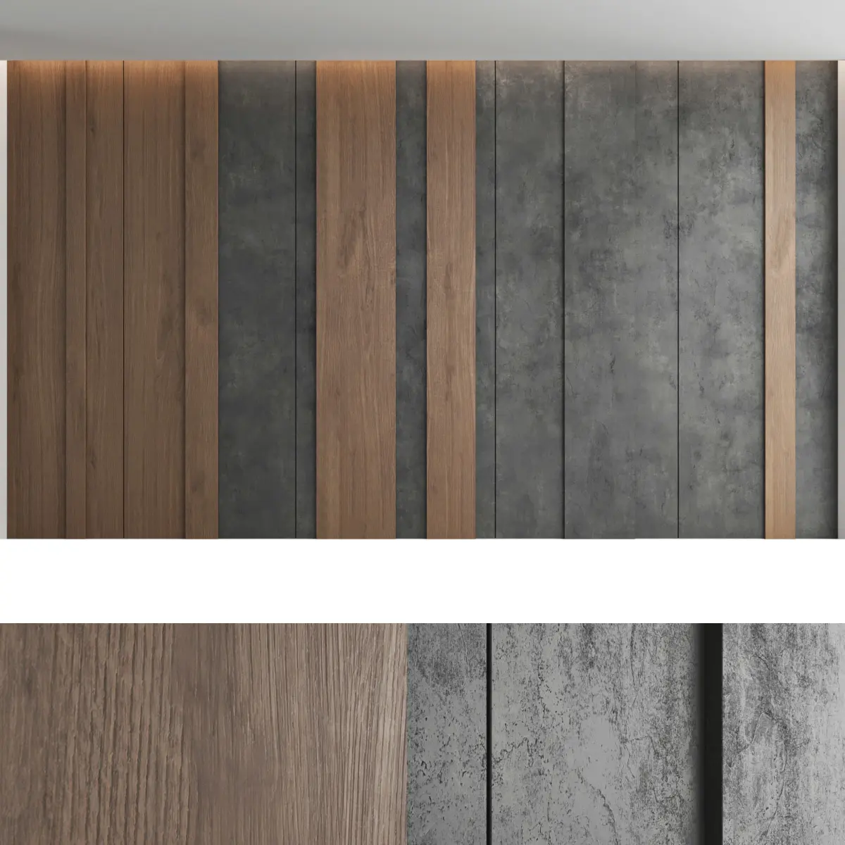Headboard and wall panel4 types of configuration3 decorative concrete materials (seamless high quality textures, resolution 8000x8000 pixels)2 wood materials (high resolution seamless oak textures, 8000x6000 pixels)Blades size: W.5000mm x H.3000mm