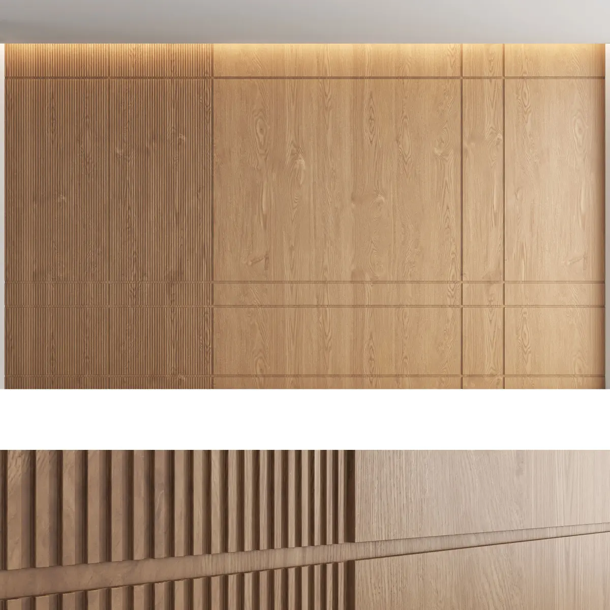 Headboard and wall panel3 types of configurations3 wood textures (high resolution seamless oak textures)1 fabric textureCanvas Size: W.5000mm x H.3000mm
