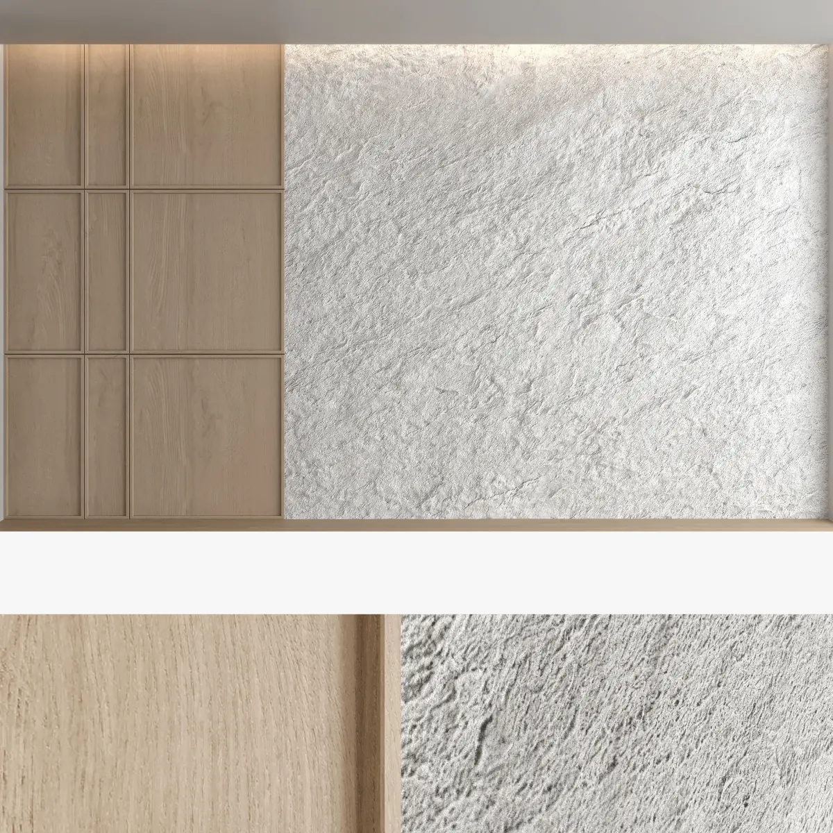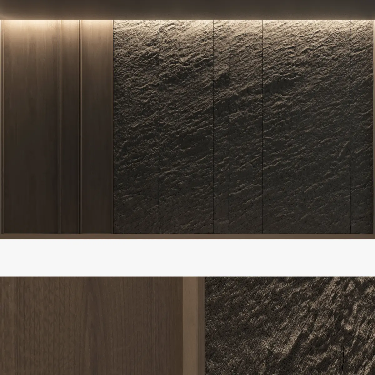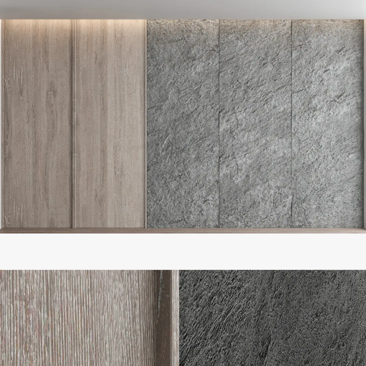 Headboard and wall panel4 panels (volume of a stone wall made with texture)4 stone wall materials, 4 wood materialsBlades size: W.5000mm x H.3000mm