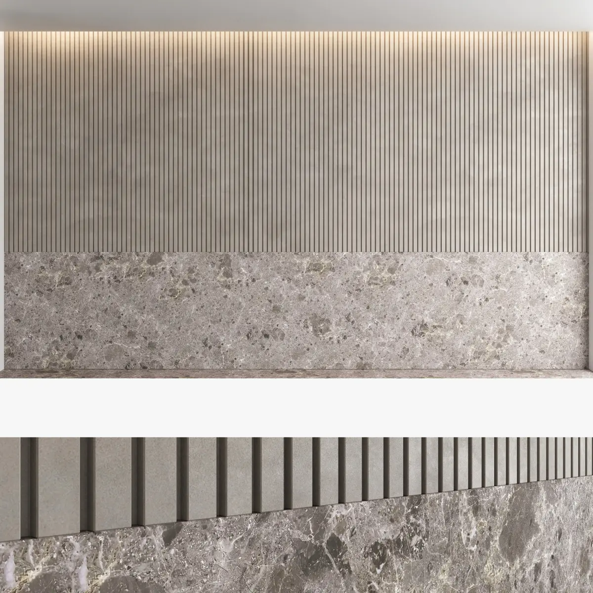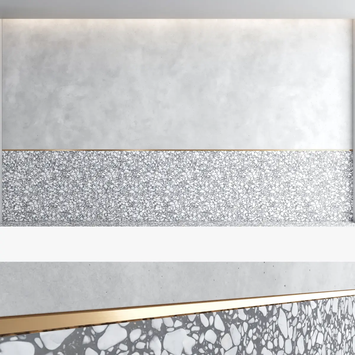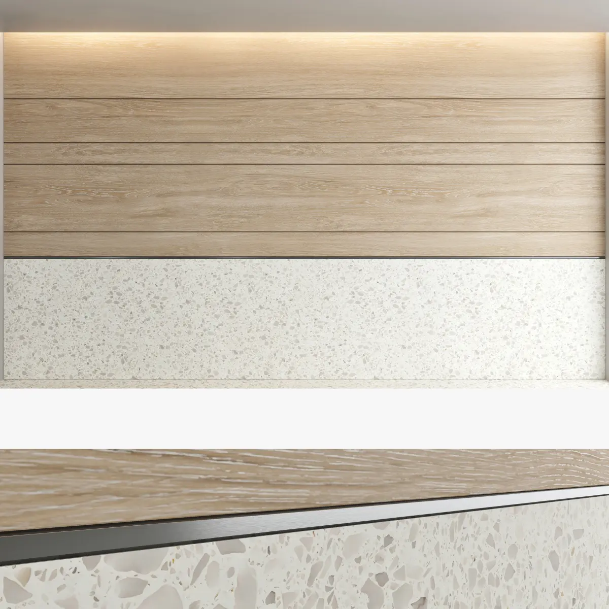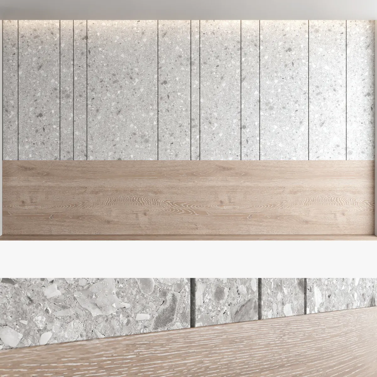 Headboard and wall panel4 types of configuration4 terrazzo materials, 2 wood materials, 1 concrete material, 1 plaster material, 2 metal materialsBlades size: W.5000mm x H.3000mm