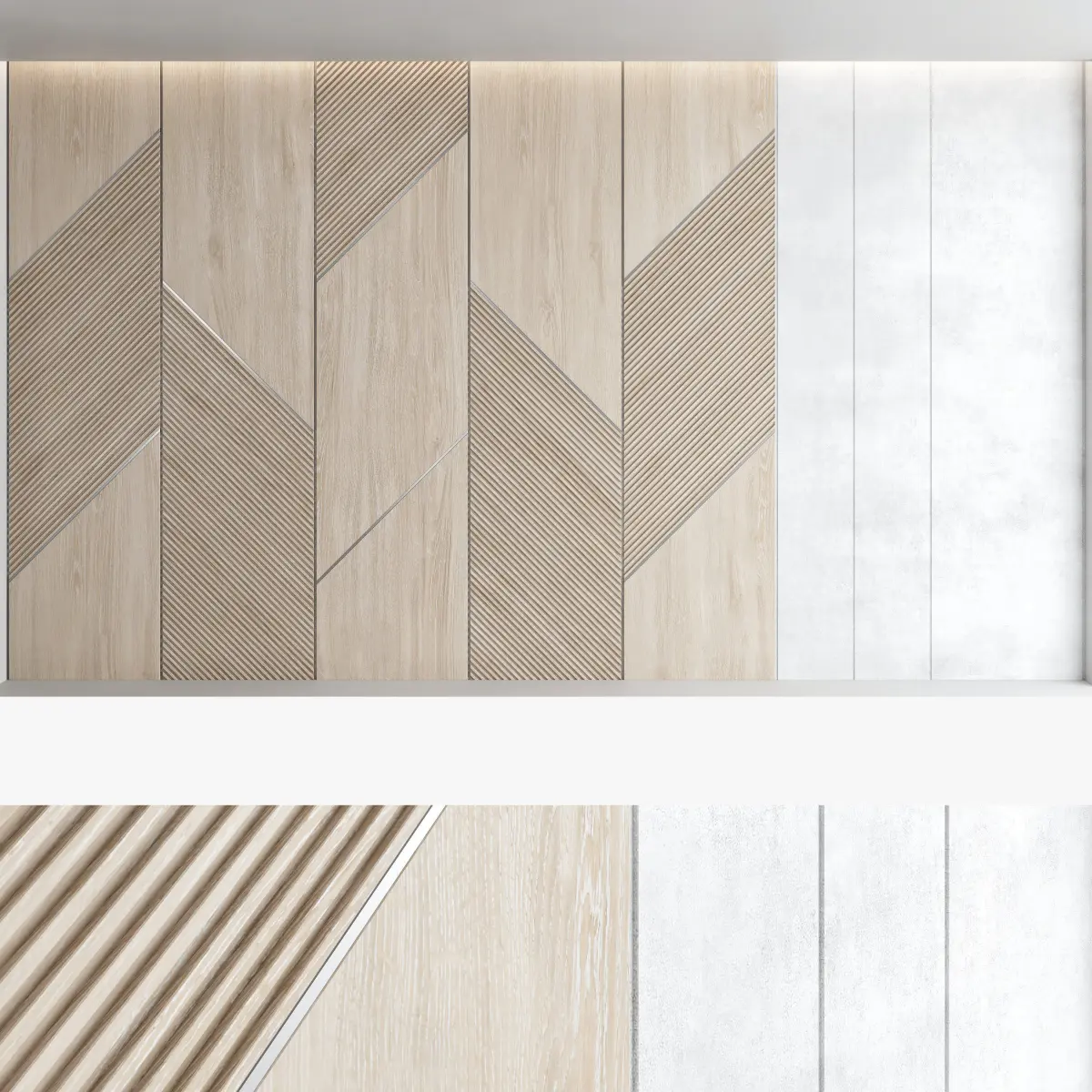 Headboard and wall panel4 types of configuration4 wood materials, 3 plaster materialsBlades size: W.5000mm x H.3000mm