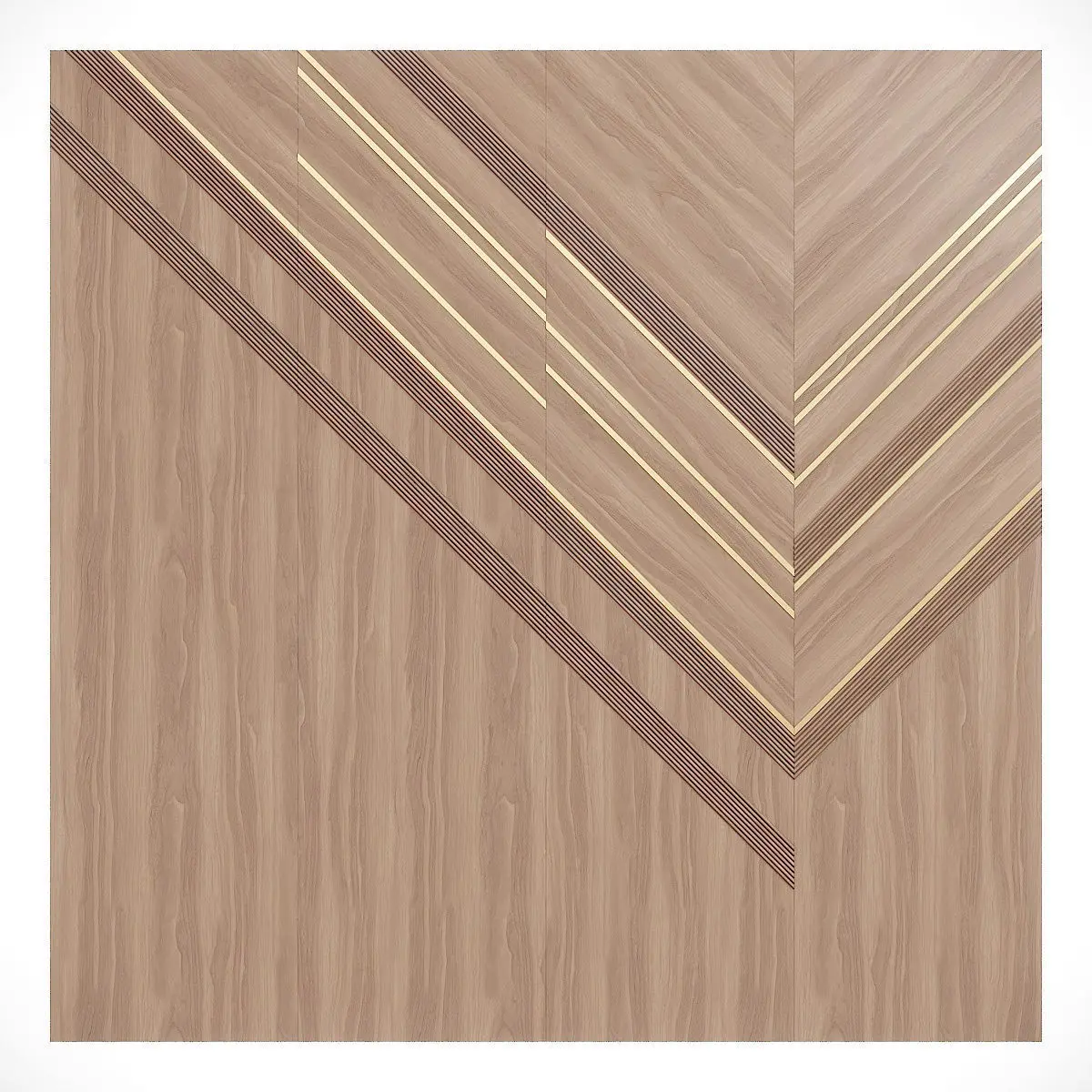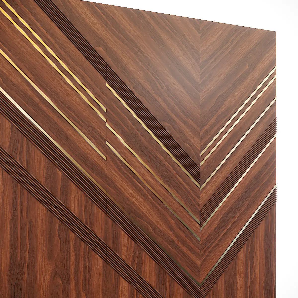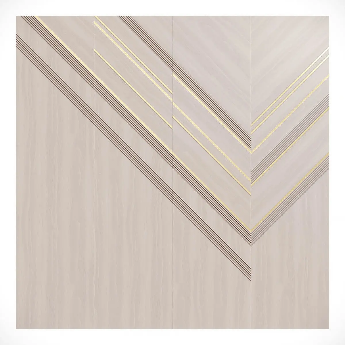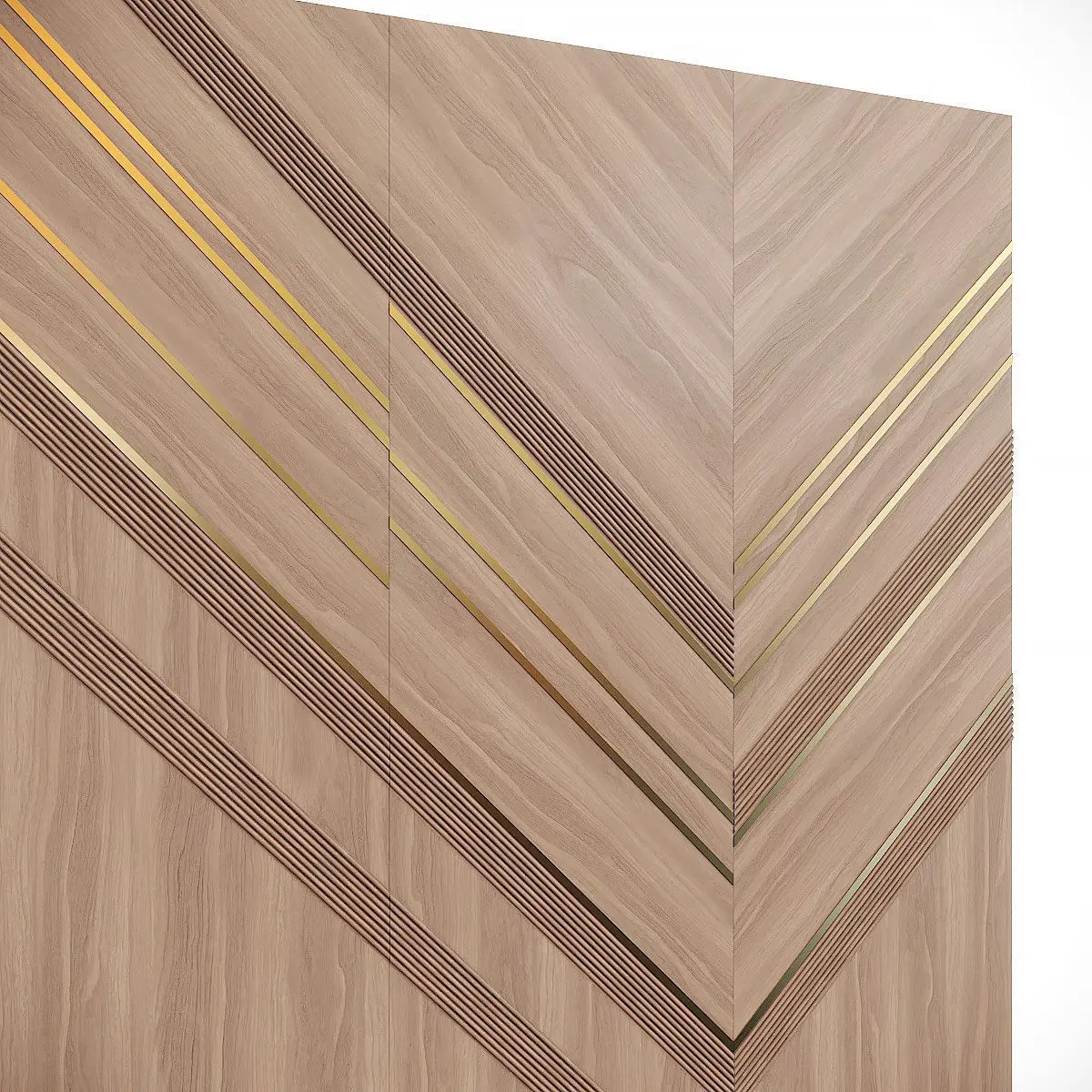 Decorative wood panel with golden profile.The diagonal milled elements lend dynamism to the restrained composition.Suitable for living room, bedroom, public spaces.The panel is divided into four parts.