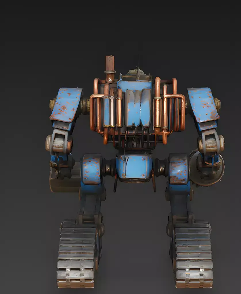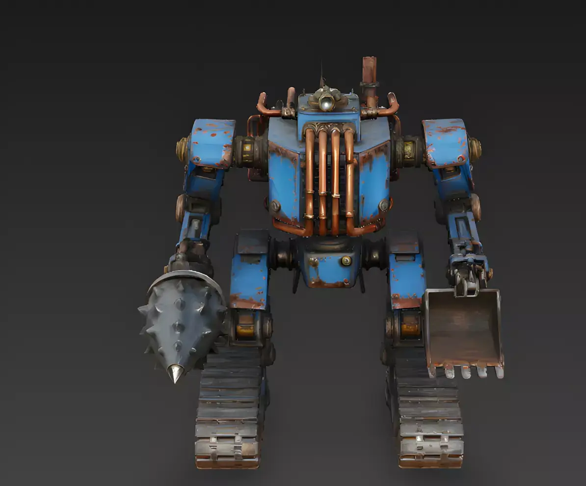 Reinforced Blue ArmorThe mech is encased in thick, riveted steel plates finished in a weathered industrial blue. The textures are masterfully aged with realistic rust patches and metal scrapes, showing the machine has spent years in the harsh environment of a deep-core mine.