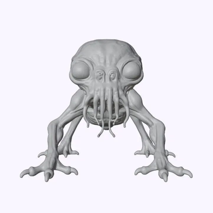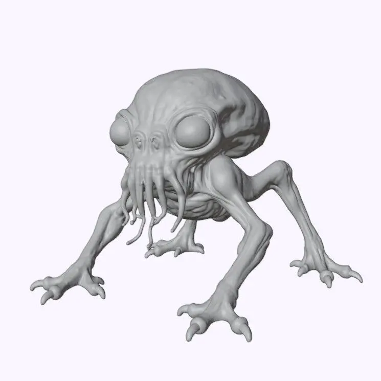 This collectible model depicts a highly detailed alien creature with an enlarged cranium, four expressive black eyes, tentacled mouthparts, and elongated limbs. Its design is perfect for sci-fi tabletop gaming, alien dioramas, or as a unique conversation piece in any collection.