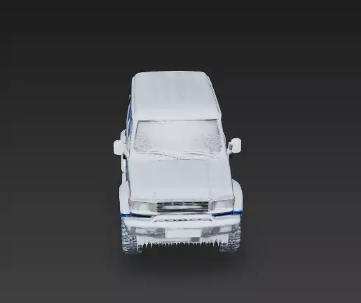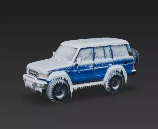 The Overall Concept This isn't just a car parked in the snow; it is a vehicle that has been frozen solid. We designed this rugged 4x4 (resembling a classic Land Cruiser) to look like it was abandoned in a blizzard or a cryo-chamber. It is perfect for arctic survival games or post-apocalyptic winter maps.