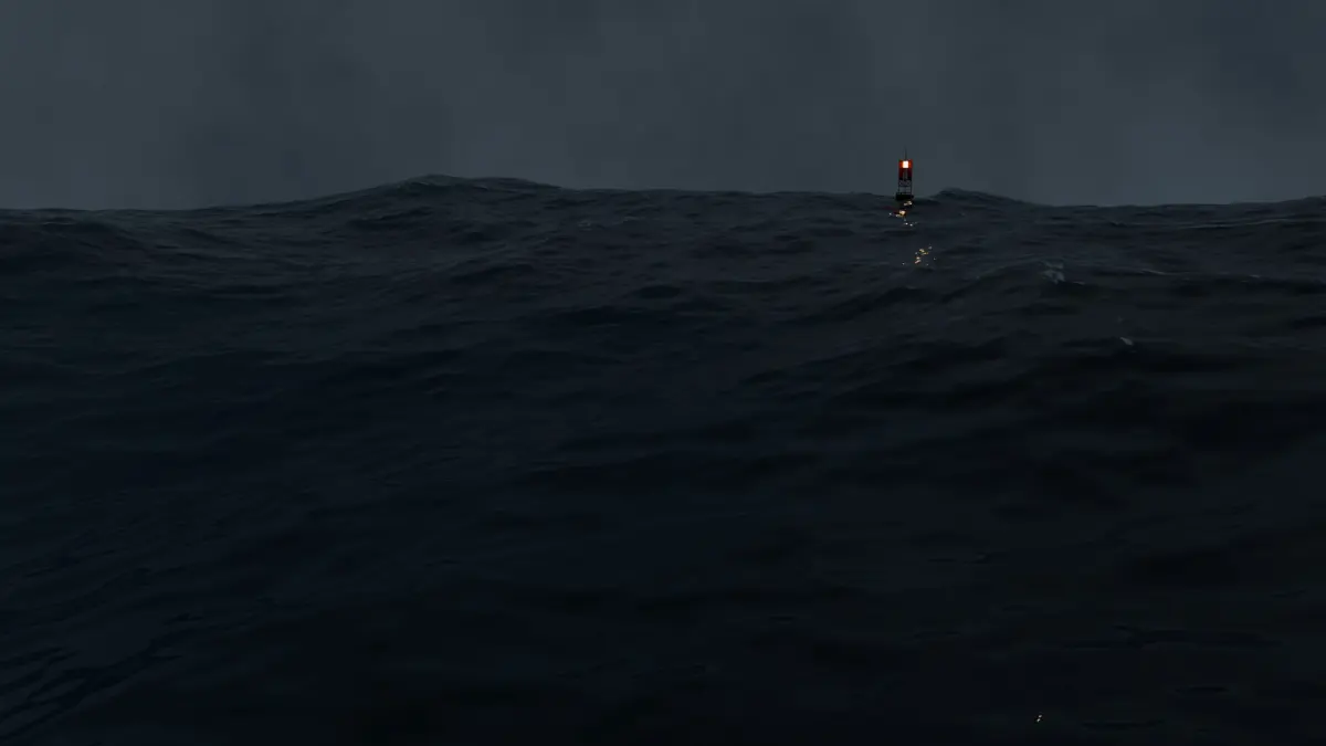 A cinematic render of a lonely red buoy floating in the vast, deep ocean during a foggy night. The scene captures the isolation and mysterious nature of the sea, with realistic water simulation and dramatic lighting. Ideal for concept art, storytelling visuals, or atmospheric scenes.