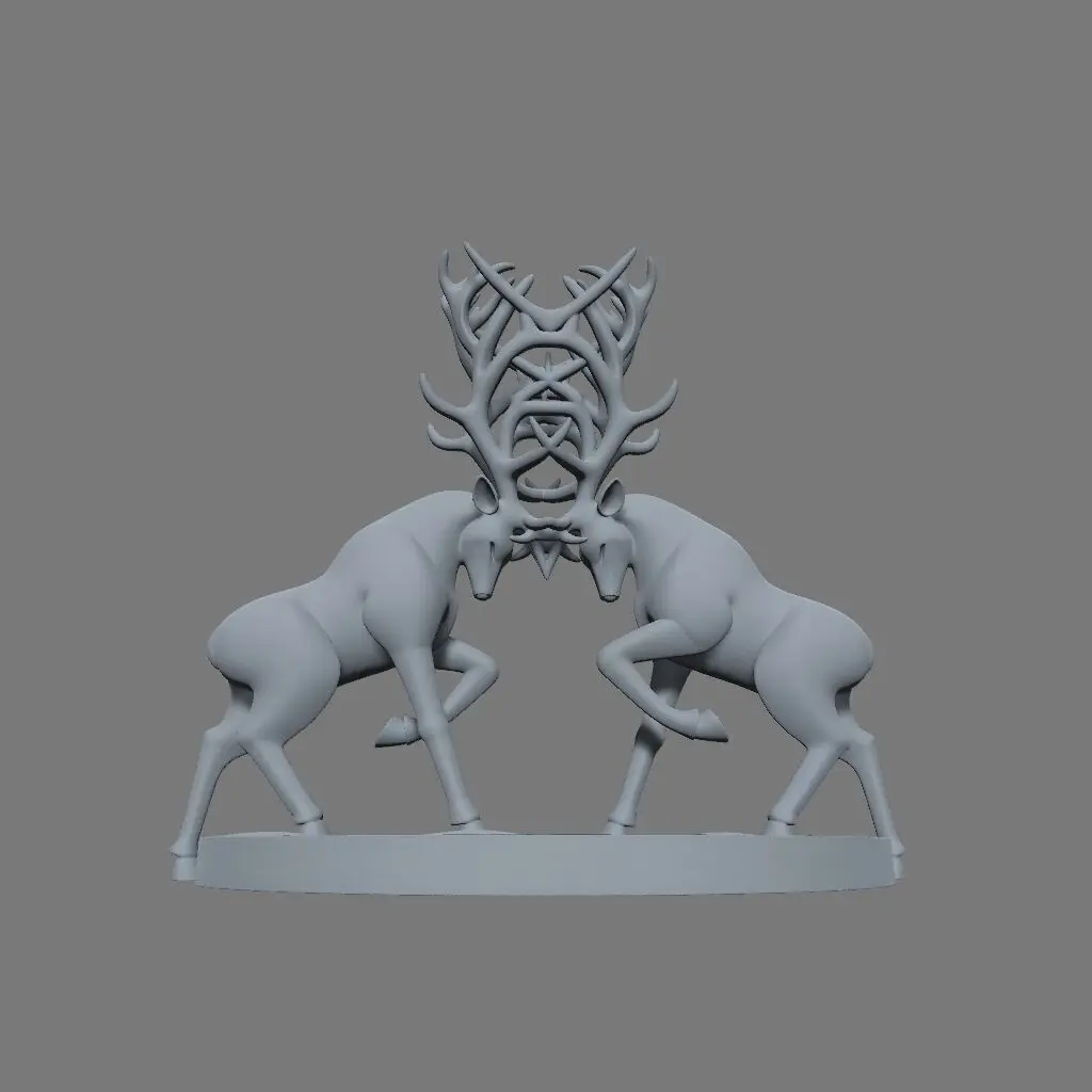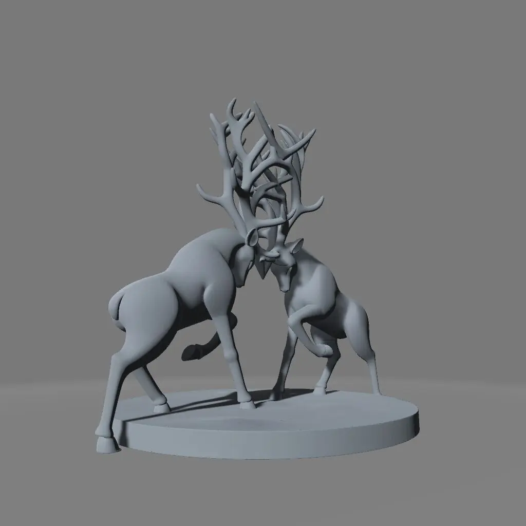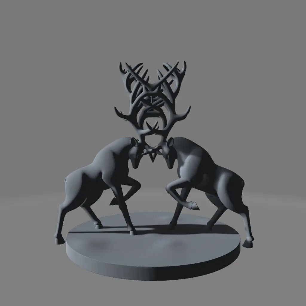 A 3D-printed sculpture of two stylized deer in a mirrored fighting pose, their lowered heads and locked antlers forming a bold circular arc at the center. The design is clean and minimalist, with smooth, texture-free bodies and a stable, flat base for effortless display. This symmetrical composition captures tension and balance in a striking, modern form — perfect for artistic or symbolic presentation.
