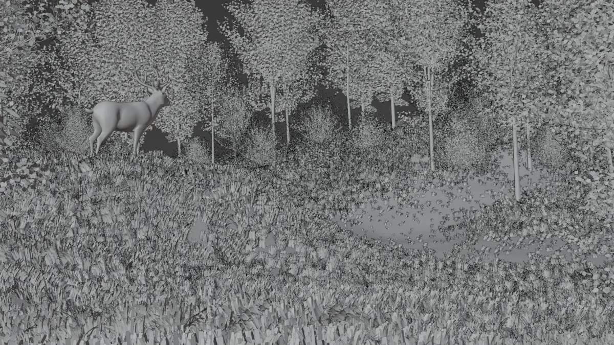 made a deer scene in the forestgrass made by geonodesall objects are textured in PBRdeer with bones with change of pose