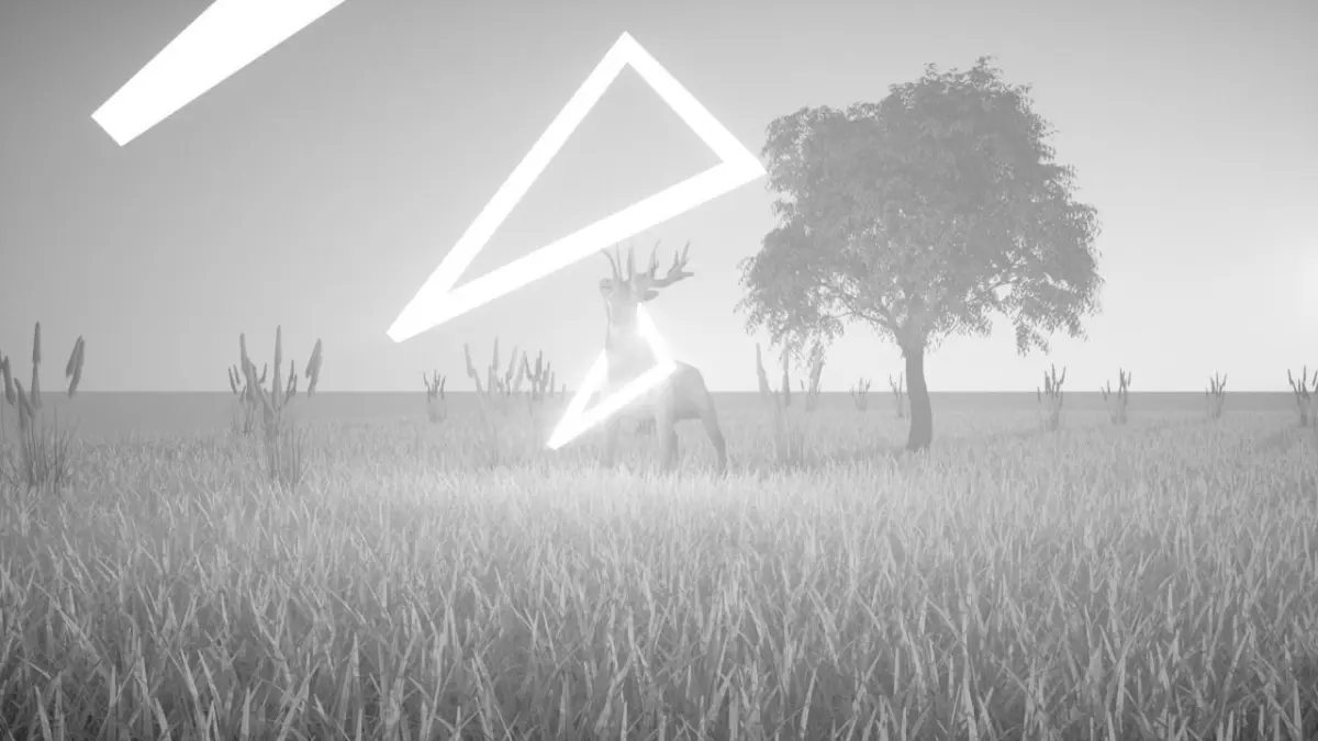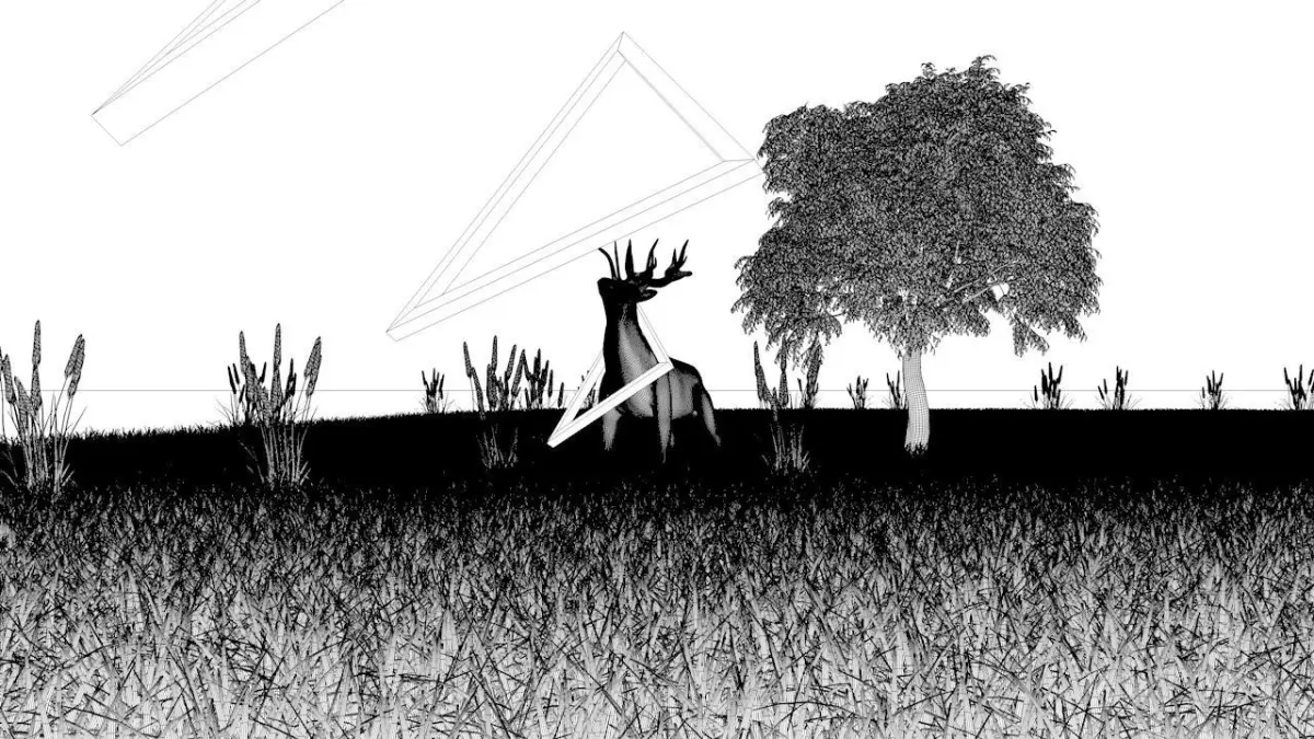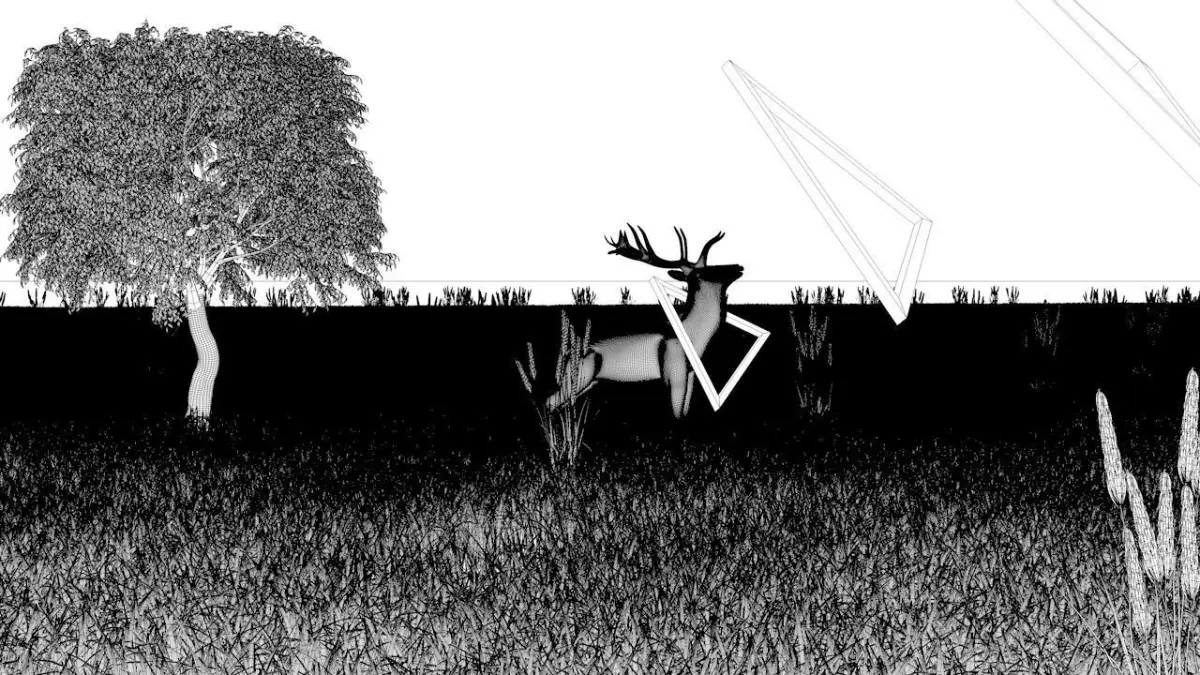 this 3D model is a nature scene with a high poly deer and a tree and grass model