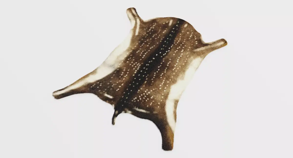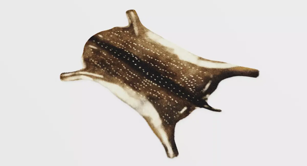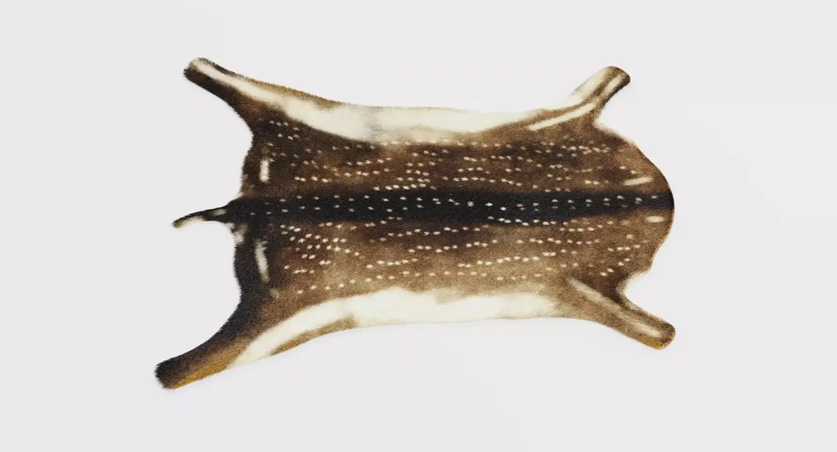 A deer-inspired animal hide with detailed surface geometry and natural coloration. The flattened layout shows the f*ull form of the rug, making it suitable for **historical, rustic, or fantasy interior scenes*.