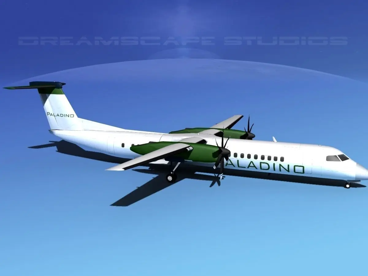 DHC-8-400 is built near to scale within a few inches of actual general dimensions and fully textured. It has many animateable features including propellers, ailerons, flaps, rudder and elevators. Landing gear can be retracted and landing gear doors closed. It is provided in several formats.