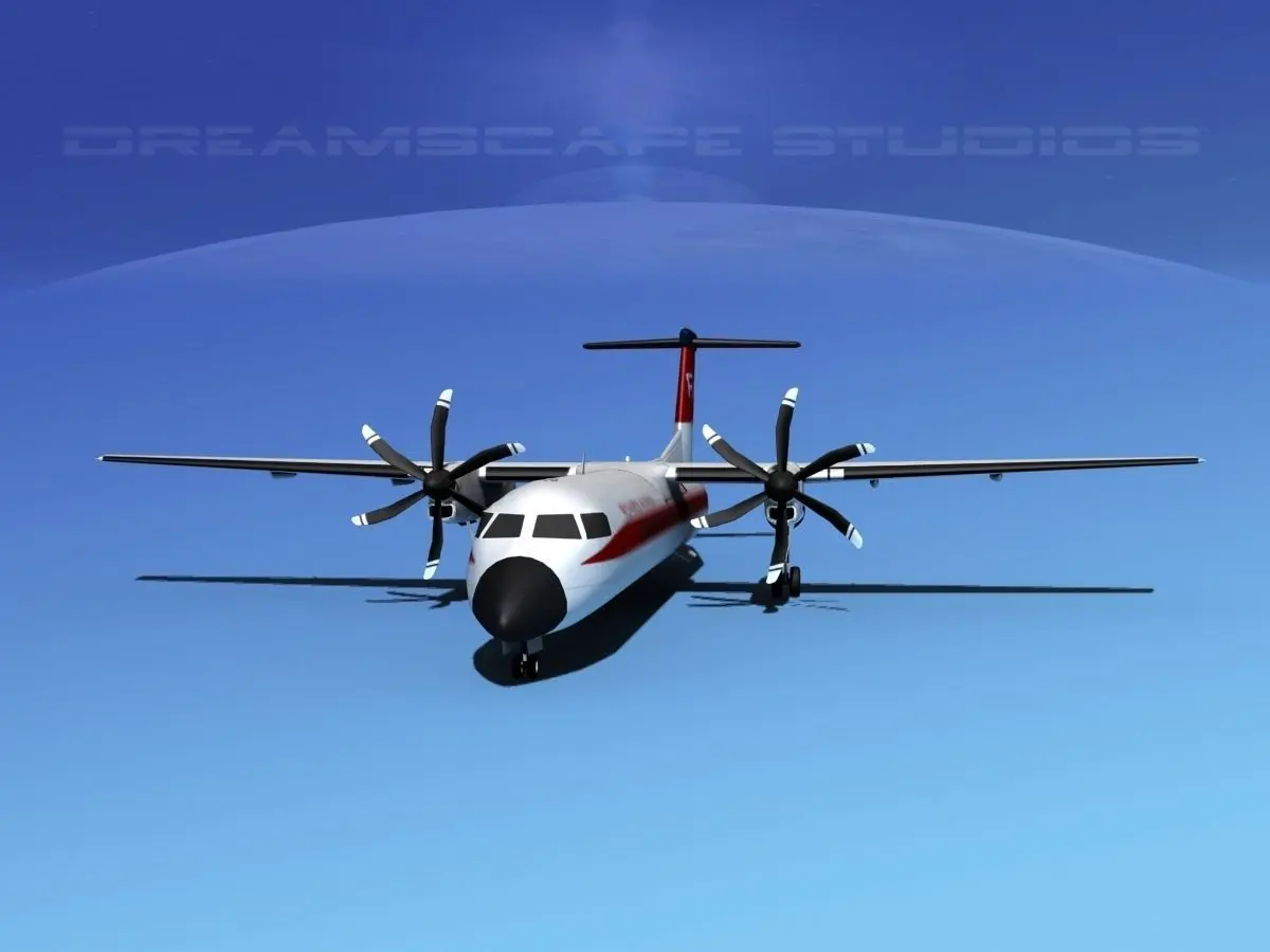 DHC-8-400 is built near to scale within a few inches of actual general dimensions and fully textured. It has many animateable features including propellers, ailerons, flaps, rudder and elevators. Landing gear can be retracted and landing gear doors closed. It is provided in several formats.