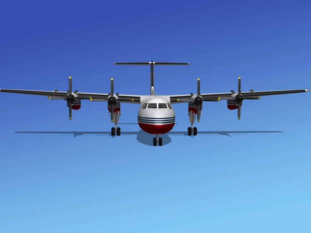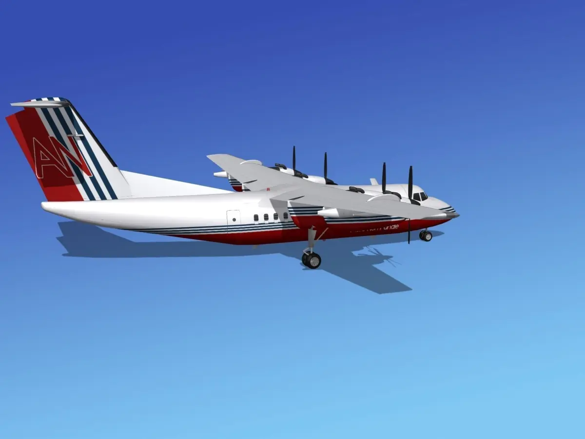 DHC-7-200 is built very near to scale, within a few inches of actual general dimensions. It includes many animateable features. The propellers, control surfaces, landing gear and landing gear doors are animateable or configurable. The model is fully textured and comes with several formats.