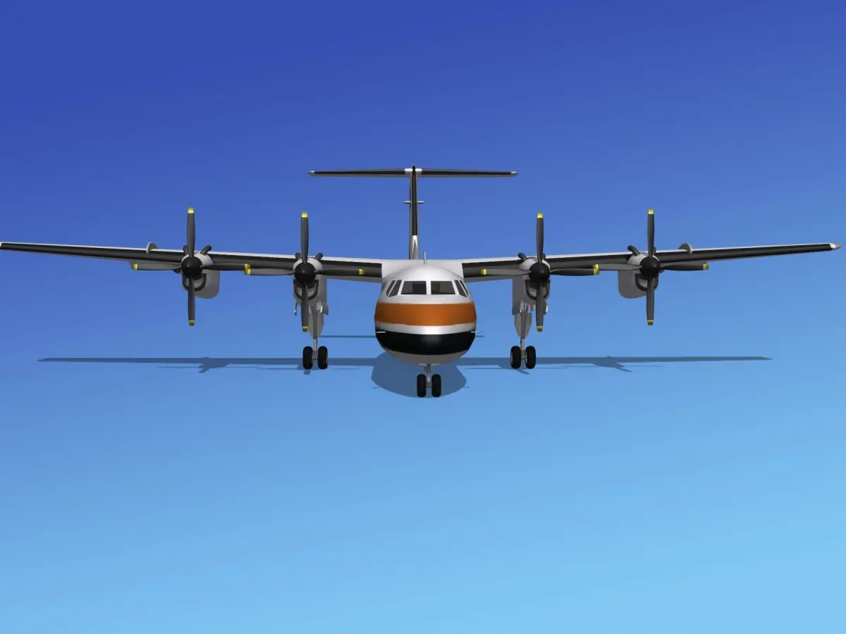 DHC-7-200 is built very near to scale, within a few inches of actual general dimensions. It includes many animateable features. The propellers, control surfaces, landing gear and landing gear doors are animateable or configurable. The model is fully textured and comes with several formats.