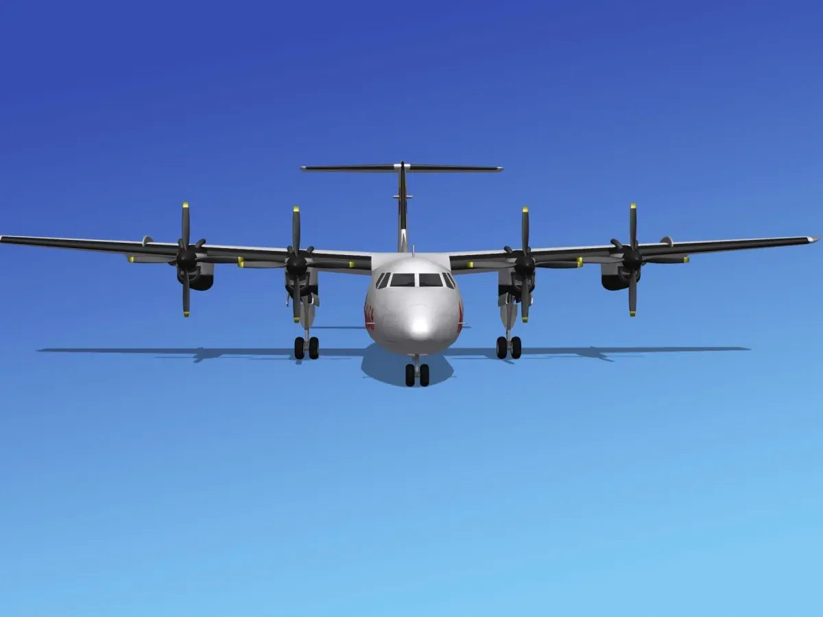 DHC-7-200 is built very near to scale, within a few inches of actual general dimensions. It includes many animateable features. The propellers, control surfaces, landing gear and landing gear doors are animateable or configurable. The model is fully textured and comes with several formats.