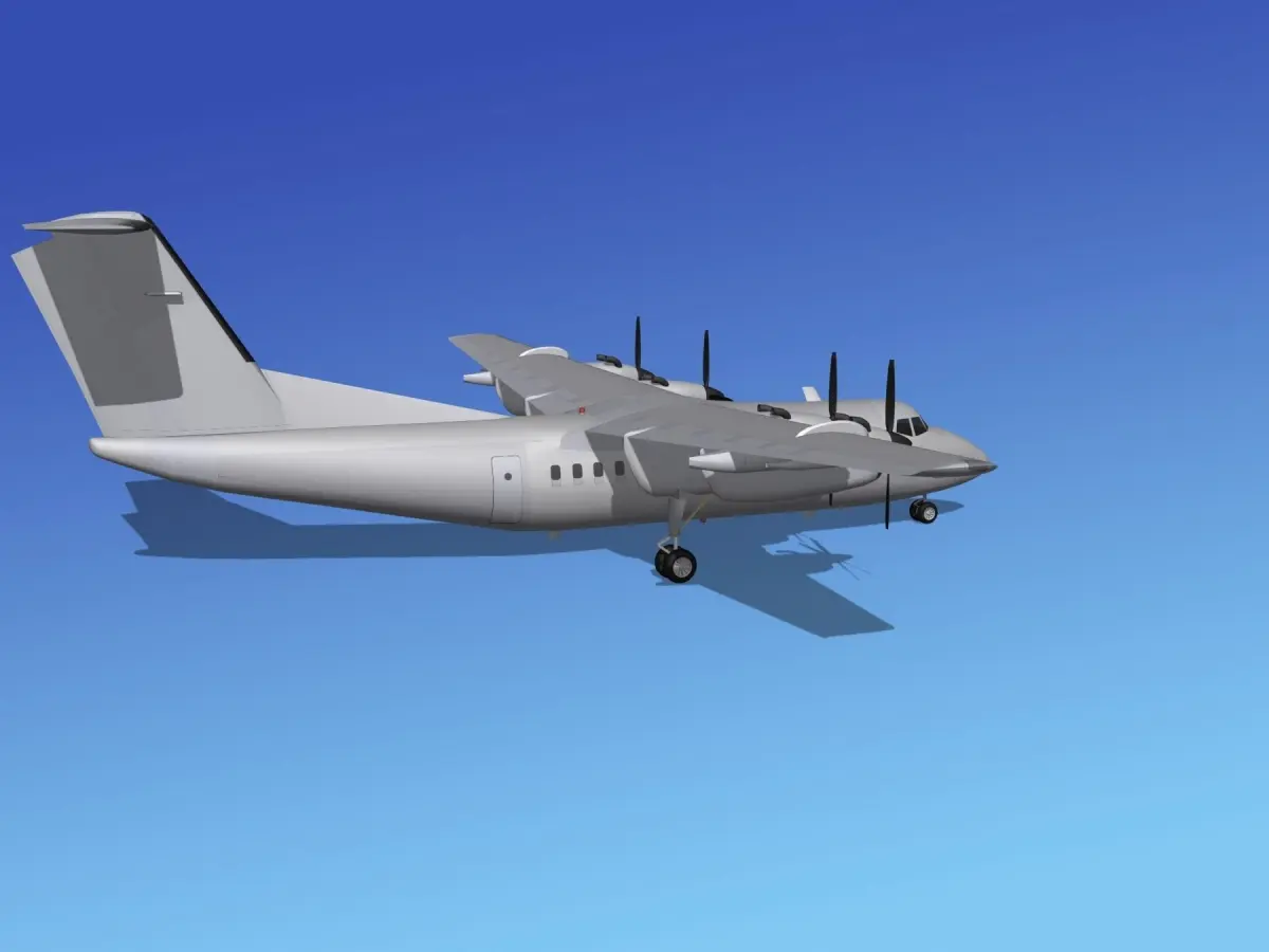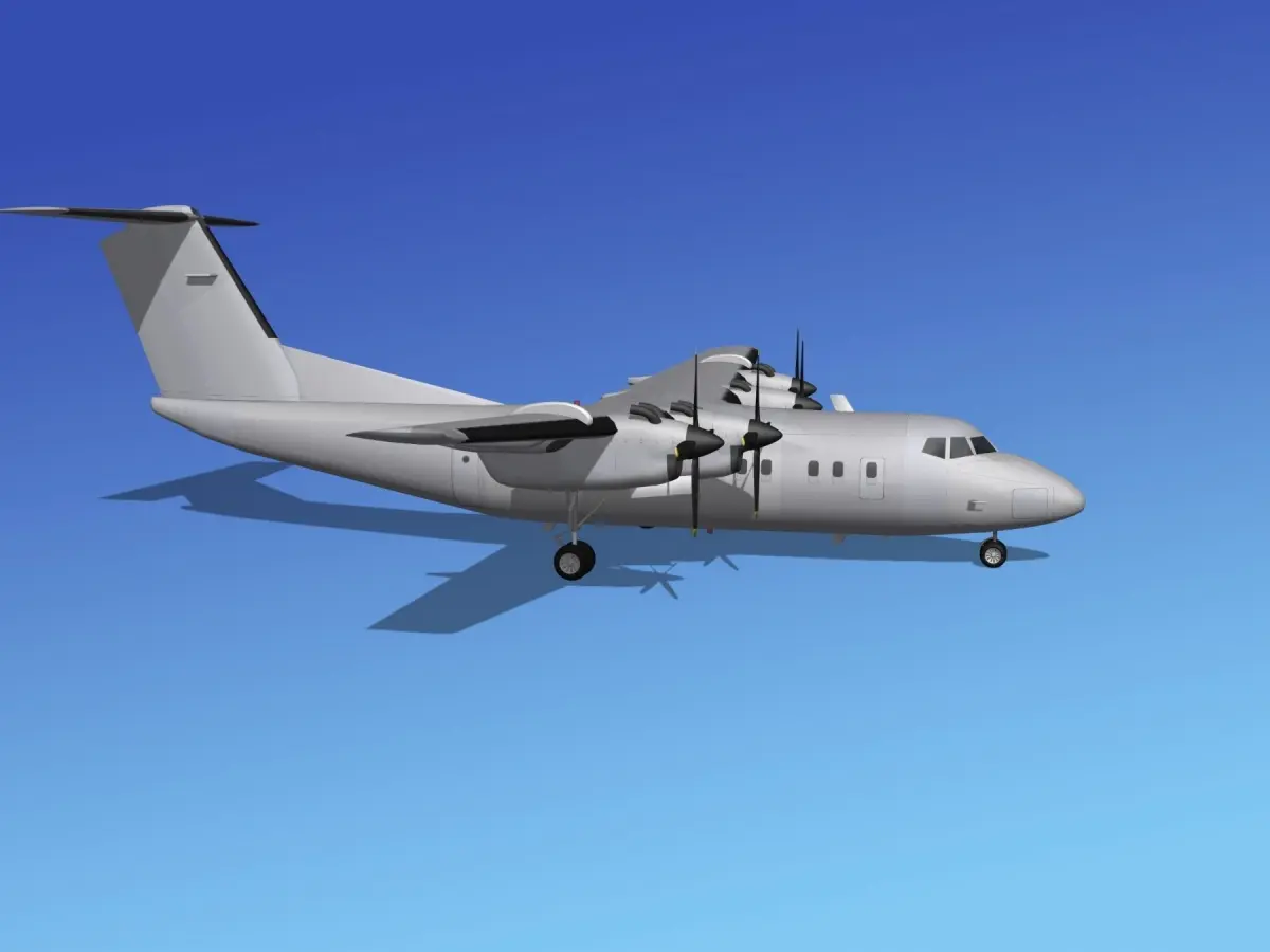DHC-7-200 is built very near to scale, within a few inches of actual general dimensions. It includes many animateable features. The propellers, control surfaces, landing gear and landing gear doors are animateable or configurable. The model is fully textured and comes with several formats.