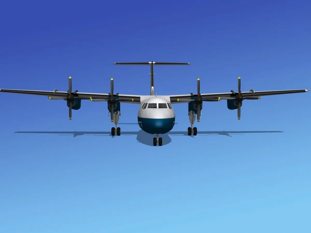 DHC-7-200 is built very near to scale, within a few inches of actual general dimensions. It includes many animateable features. The propellers, control surfaces, landing gear and landing gear doors are animateable or configurable. The model is fully textured and comes with several formats.