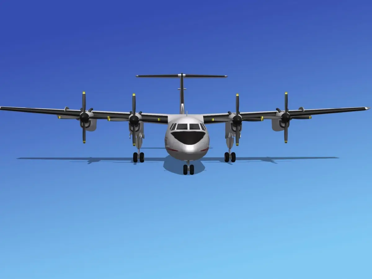DHC-7-200 is built very near to scale, within a few inches of actual general dimensions. It includes many animateable features. The propellers, control surfaces, landing gear and landing gear doors are animateable or configurable. The model is fully textured and comes with several formats.