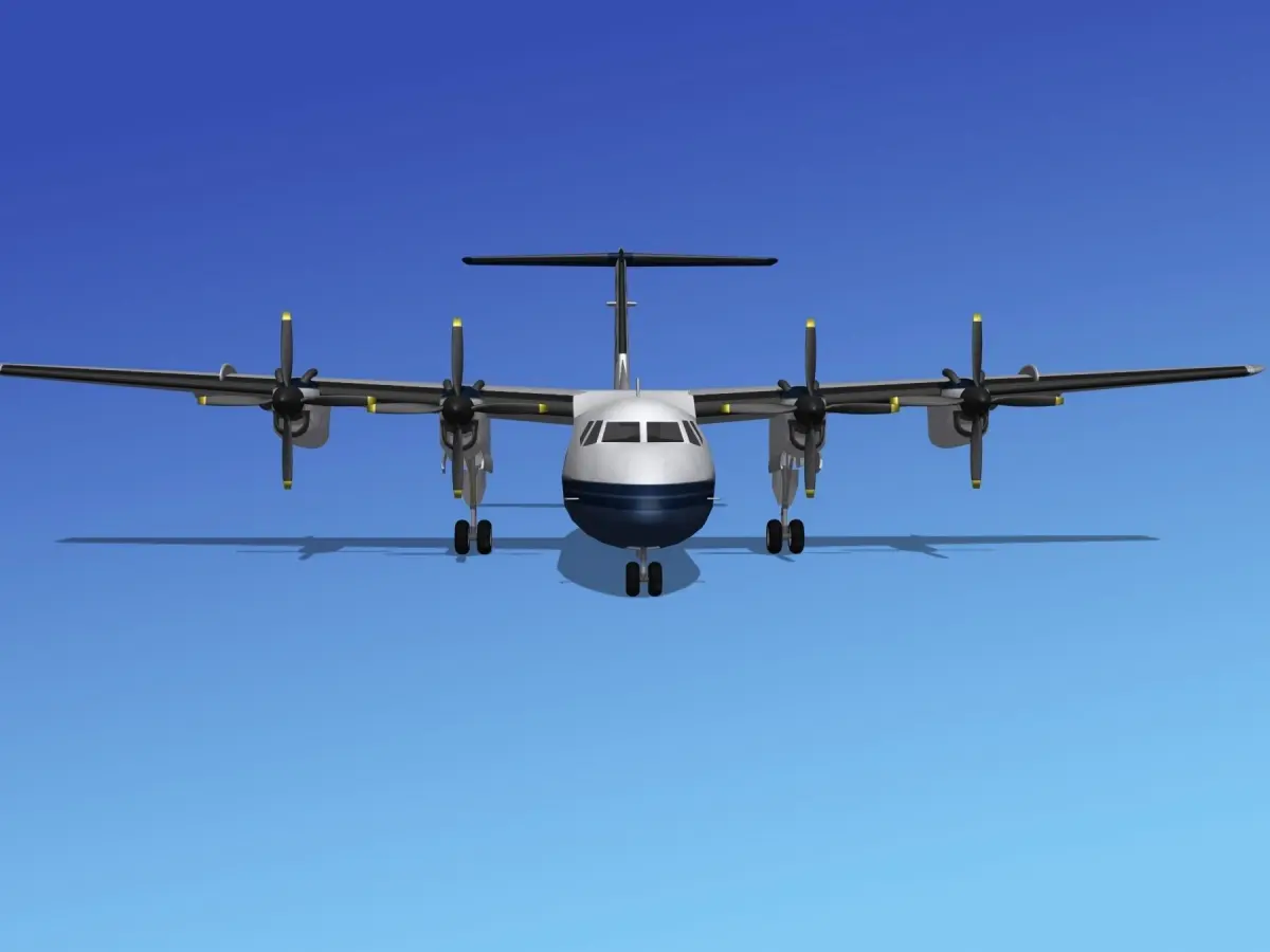 DHC-7-200 is built very near to scale, within a few inches of actual general dimensions. It includes many animateable features. The propellers, control surfaces, landing gear and landing gear doors are animateable or configurable. The model is fully textured and comes with several formats.