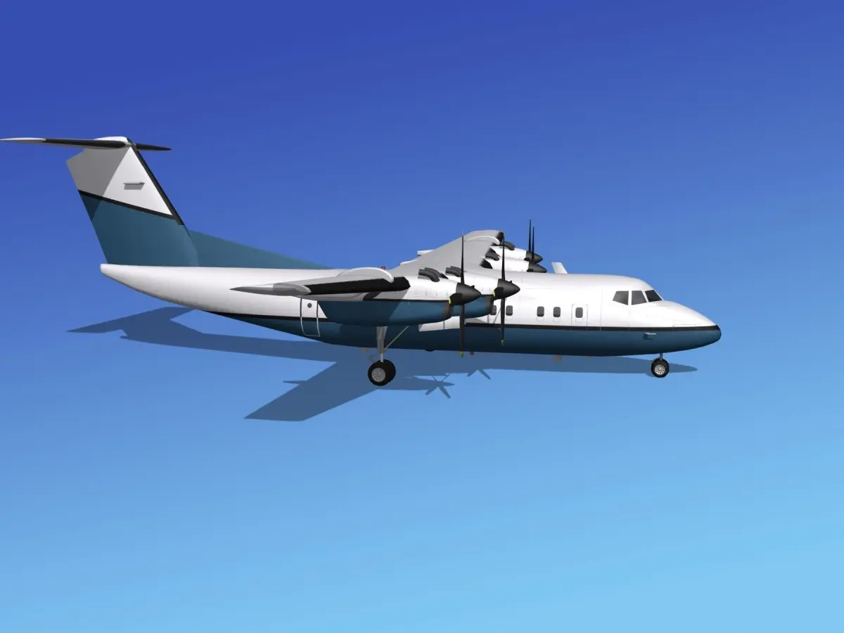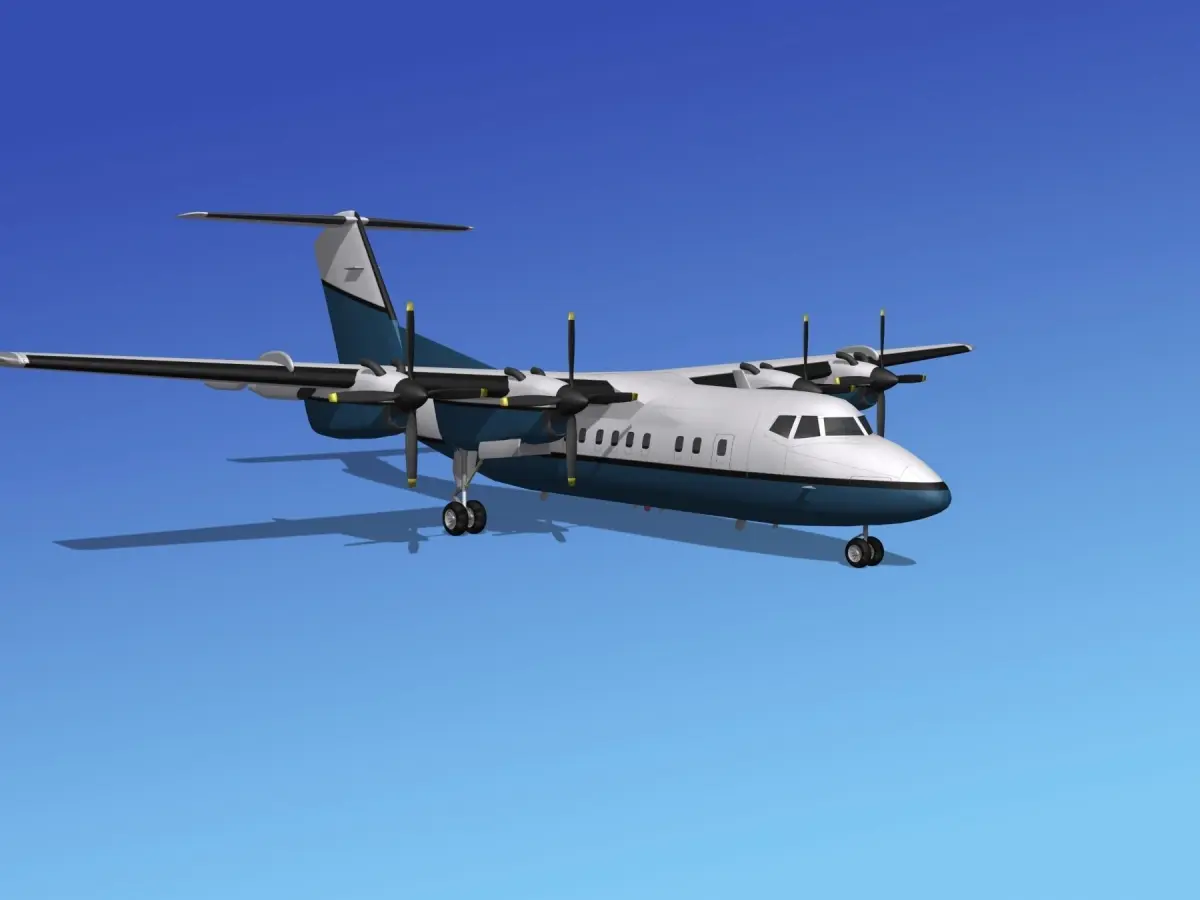 DHC-7-200 is built very near to scale, within a few inches of actual general dimensions. It includes many animateable features. The propellers, control surfaces, landing gear and landing gear doors are animateable or configurable. The model is fully textured and comes with several formats.