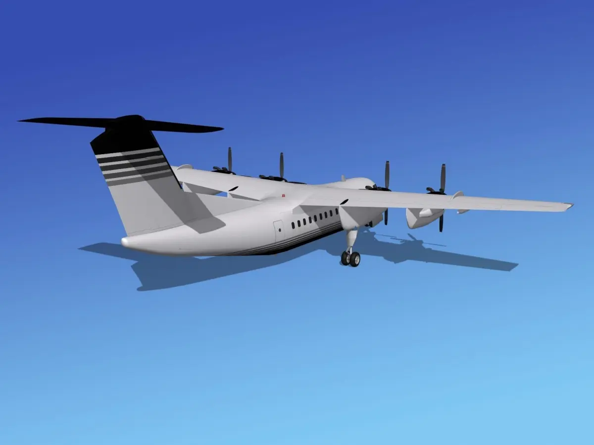 DHC-7-200 is built very near to scale, within a few inches of actual general dimensions. It includes many animateable features. The propellers, control surfaces, landing gear and landing gear doors are animateable or configurable. The model is fully textured and comes with several formats.