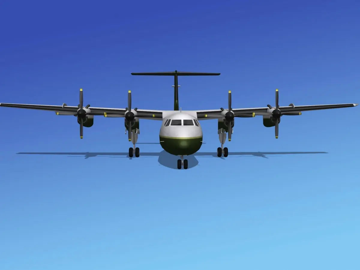 DHC-7-200 is built very near to scale, within a few inches of actual general dimensions. It includes many animateable features. The propellers, control surfaces, landing gear and landing gear doors are animateable or configurable. The model is fully textured and comes with several formats.