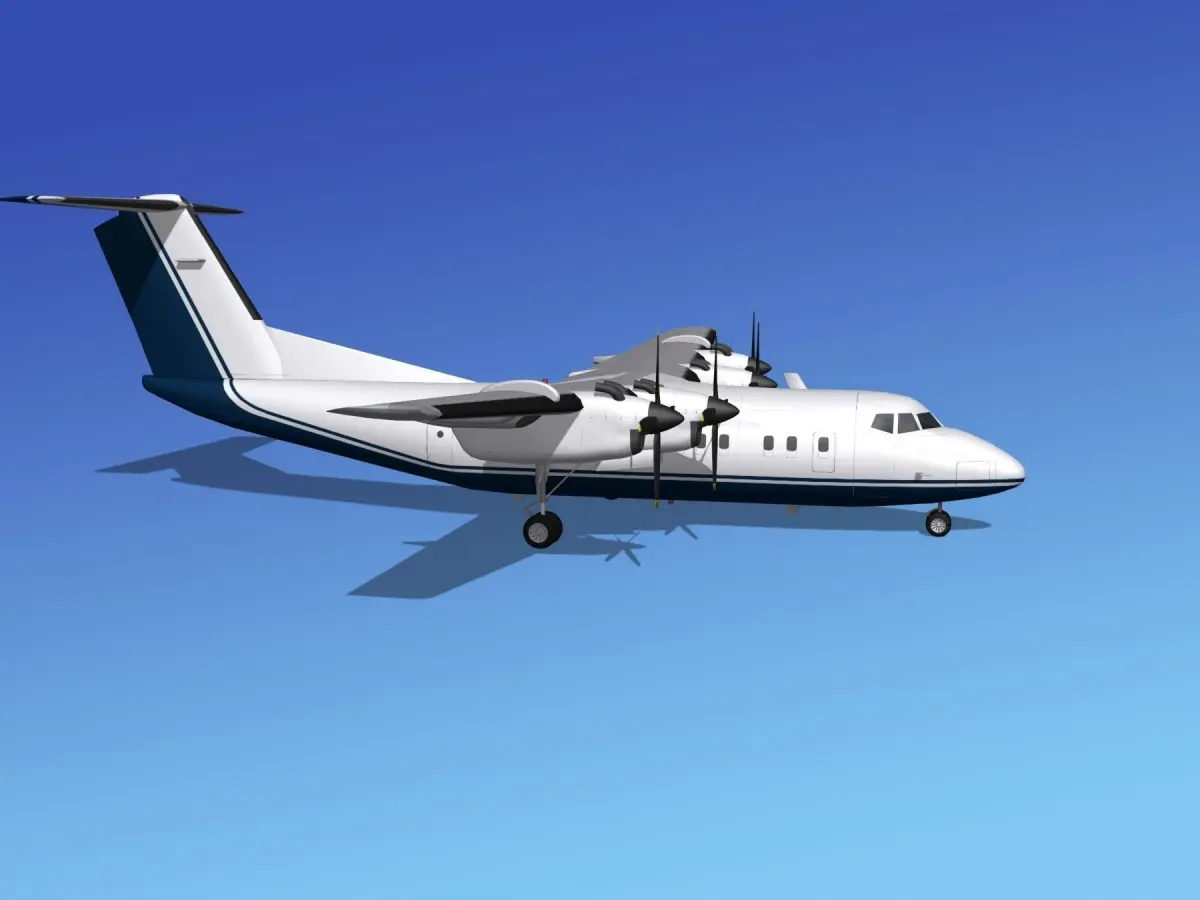 DHC-7-200 is built very near to scale, within a few inches of actual general dimensions. It includes many animateable features. The propellers, control surfaces, landing gear and landing gear doors are animateable or configurable. The model is fully textured and comes with several formats.