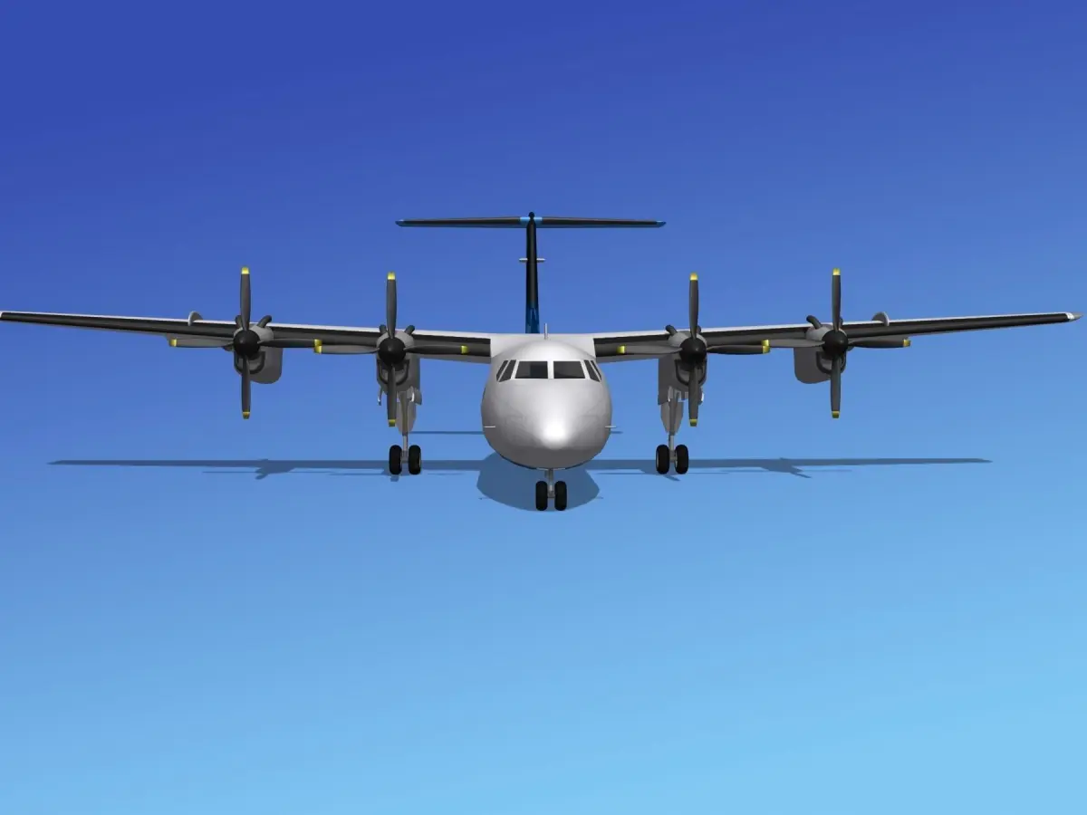 DHC-7-200 is built very near to scale, within a few inches of actual general dimensions. It includes many animateable features. The propellers, control surfaces, landing gear and landing gear doors are animateable or configurable. The model is fully textured and comes with several formats.