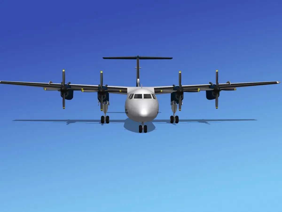DHC-7-200 is built very near to scale, within a few inches of actual general dimensions. It includes many animateable features. The propellers, control surfaces, landing gear and landing gear doors are animateable or configurable. The model is fully textured and comes with several formats.