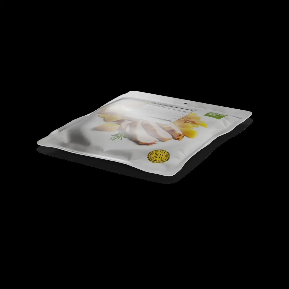Cooked Chicken Breast: Tender and succulent cooked chicken breast slices, ready to be enjoyed. The slices are neatly arranged in a resealable plastic pouch, ensuring maximum freshness and convenience. The packaging is adorned with a vibrant yellow color scheme, featuring an image of the delicious chicken breast slices. The label includes nutritional information, serving suggestions, and a Best Before date, providing all the necessary details for a satisfying meal.