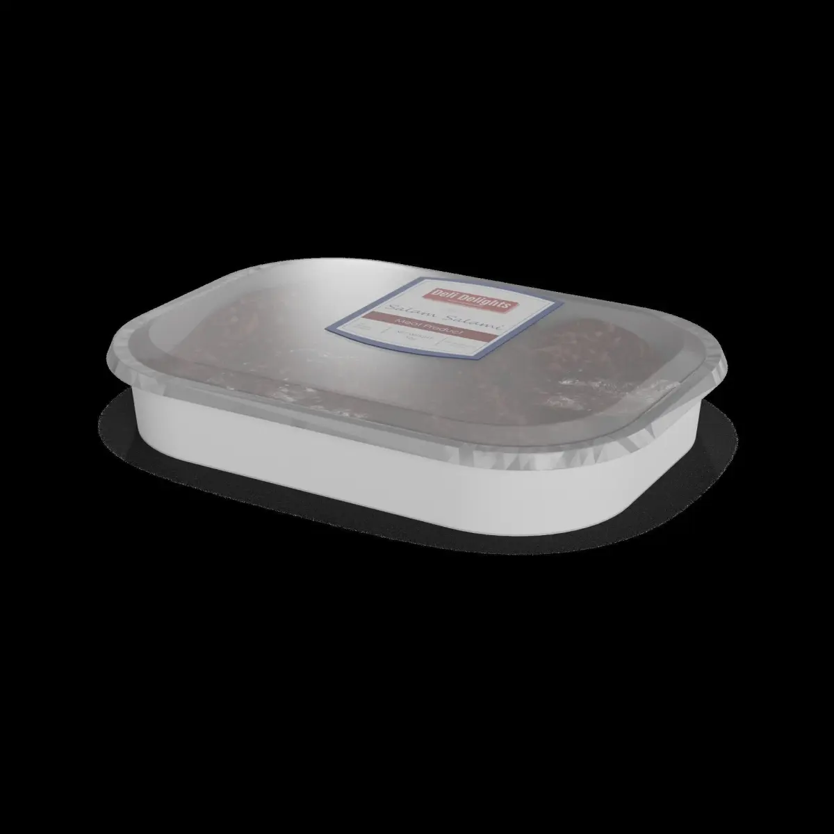 Deli Salami: Experience the bold and savory flavors of deli salami. The salami slices are carefully arranged in a vacuum-sealed plastic pack, preserving their taste and aroma. The packaging showcases a vibrant red and white color scheme, with an enticing image of the salami slices on the front. The label includes the product name, weight, and storage instructions, making it easy to enjoy this delicious deli meat.