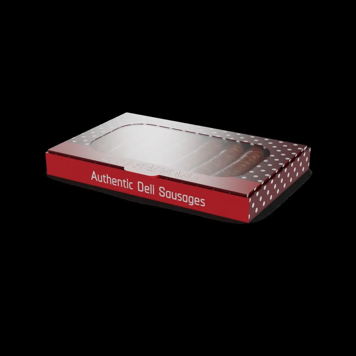Deli Sausages: Our deli sausages are a true delight for your taste buds. They come in a charming red and white polka dot packaging, reminiscent of a traditional deli. The sausages are neatly arranged in a clear plastic tray, allowing you to see their juicy goodness. The label on the packaging showcases a smiling chef holding a platter of sausages, with the text Authentic Deli Sausages written in a playful font.