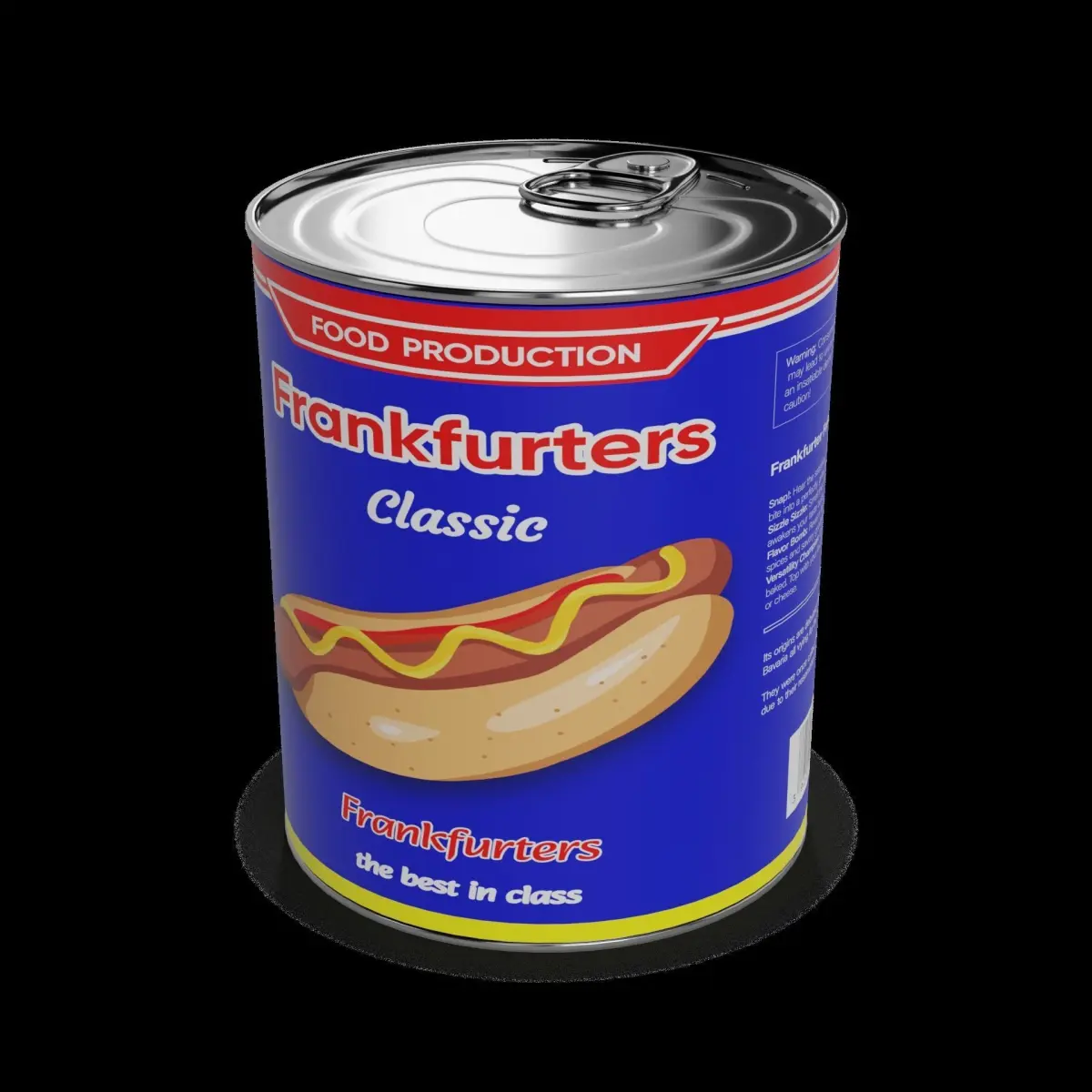 Frankfurters: Classic frankfurters, great for barbecues or hot dog buns. The frankfurters are packed in a cylindrical tin can, sealed with a metal lid. The packaging is predominantly silver, with a picture of the frankfurters on the front. The label includes the product name, weight, and serving suggestions.