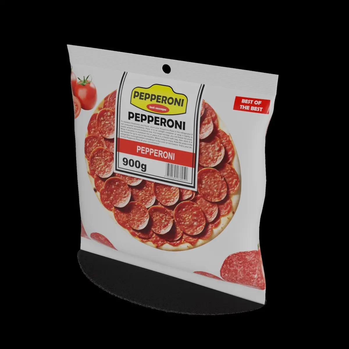 Pepperoni Slices: Spicy pepperoni slices, great for adding a kick to pizzas or pasta dishes. The slices are packed in a resealable plastic bag, ensuring freshness. The packaging is predominantly red, with a picture of the pepperoni slices on the front. The label includes the product name, weight, and storage instructions.