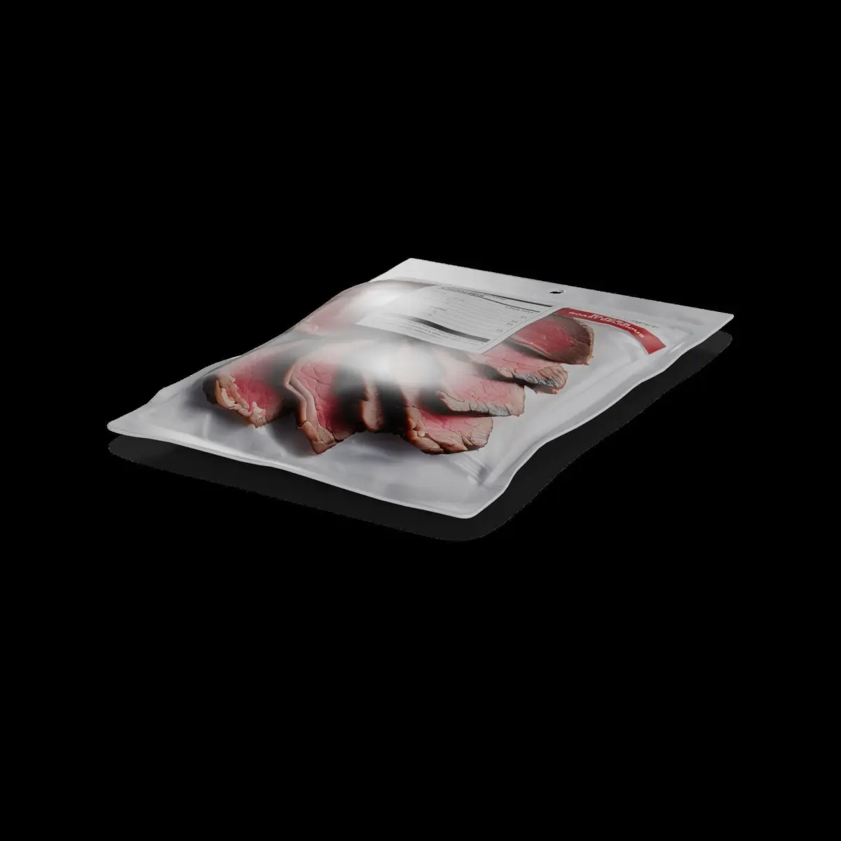 Roast Beef Slices: Treat yourself to tender and flavorful roast beef slices. The slices are carefully arranged in a resealable plastic pouch, ensuring long-lasting freshness. The packaging showcases a bold red and black color scheme, with an enticing image of the roast beef on the front. The label includes nutritional information, serving suggestions, and a Best Before date, providing all the necessary details for a satisfying meal.