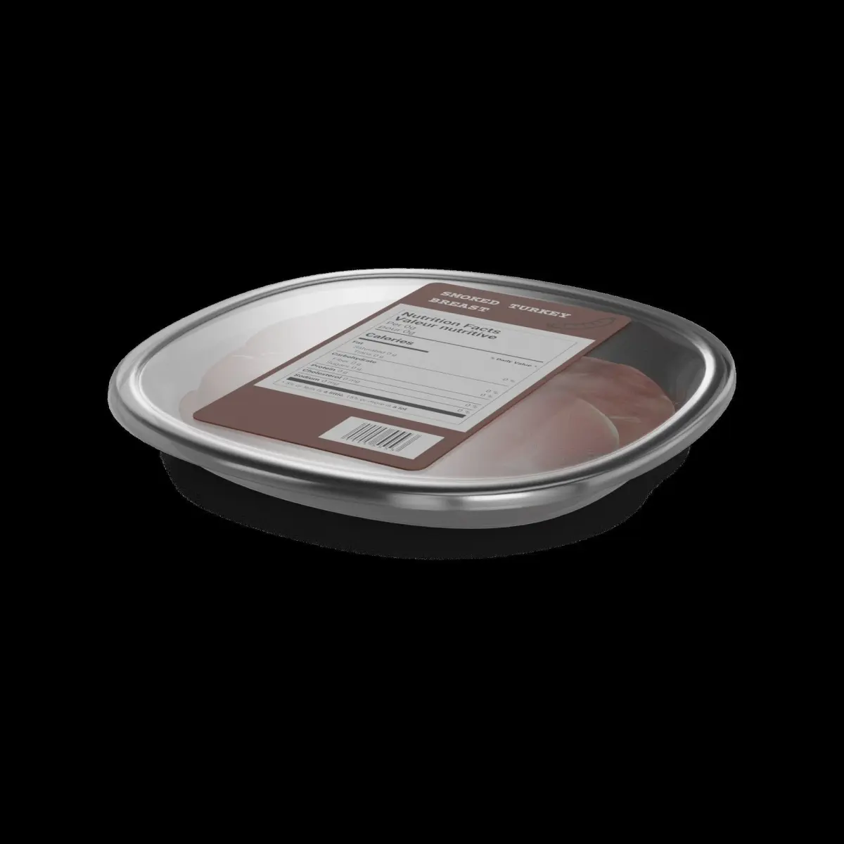 Smoked Turkey Breast: Thinly sliced smoked turkey breast, perfect for sandwiches or salads. The slices are packed in a resealable zip-lock bag, ensuring freshness. The packaging is predominantly brown, with a picture of the turkey slices on the front. The label includes the product name, weight, and storage instructions.