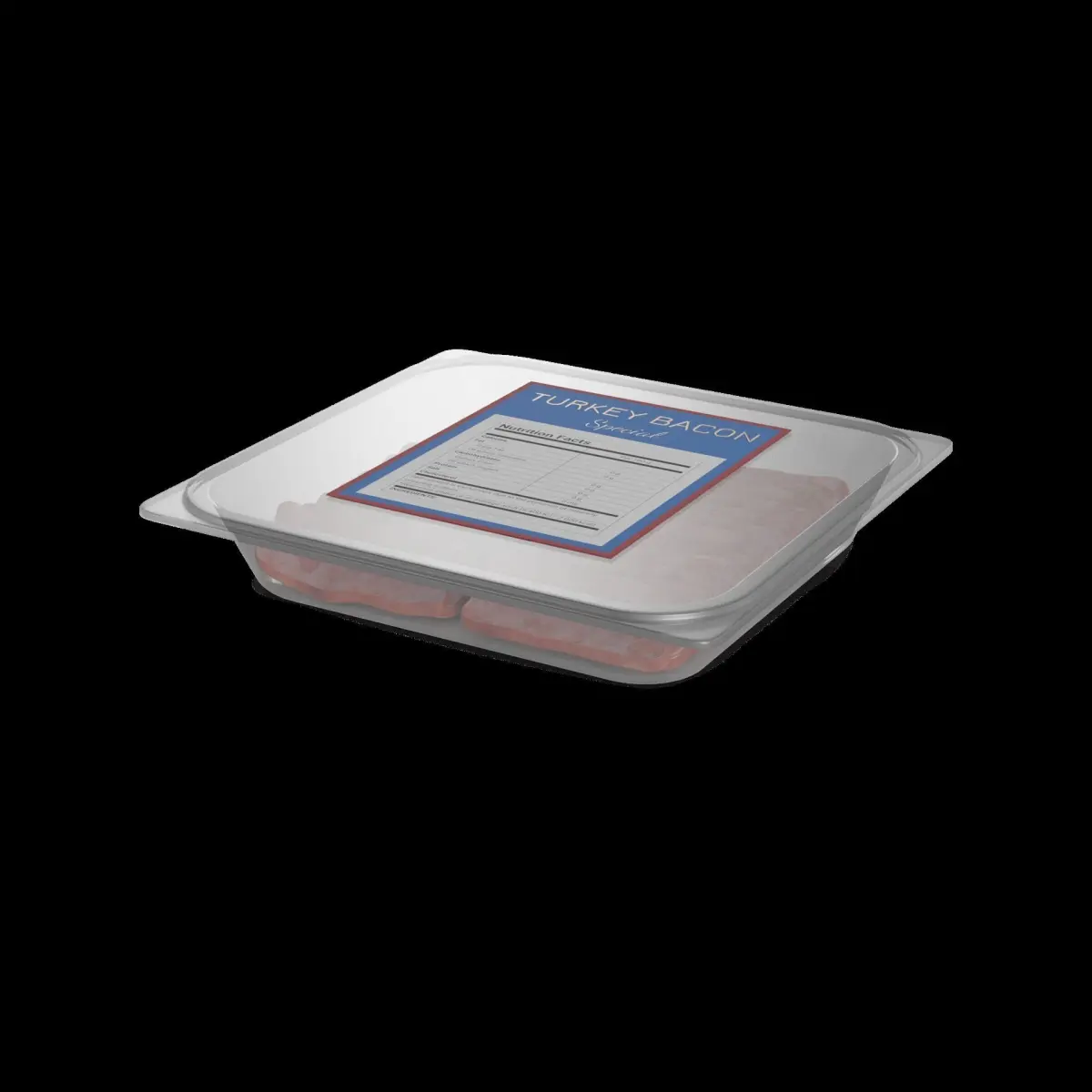 Turkey Bacon: Delicious turkey bacon slices, a healthier alternative to traditional bacon. The slices are packed in a rectangular plastic tray, covered with a clear plastic film. The packaging features a combination of white and light blue colors, with a picture of the bacon slices on the front. The label includes the product name, weight, and cooking instructions.