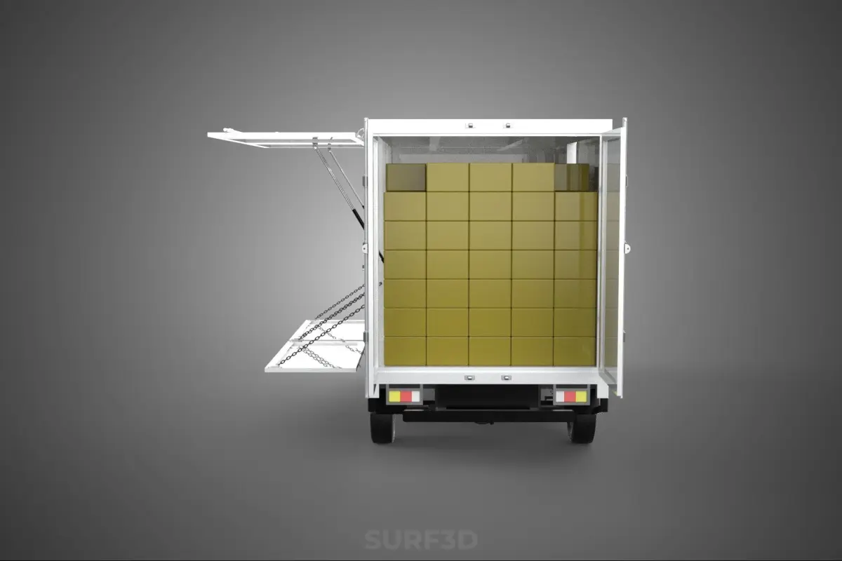 A box truck, also widely known as a cube van, straight truck, or box van, is a type of commercial vehicle featuring a chassis cab upon which a separate, enclosed, cuboidal or rectangular cargo area (the box) is mounted. This design distinguishes it from a conventional van, where the cargo space is integral to the vehicle's overall body structure. The scenario described by the string DELIVERY BOX TRUCK PICKUP LOADED BOXES CARGO FREIGHT CUBE VAN specifically refers to such a vehicle being utilized for the collection (pickup) of goods and subsequently being in a state of carrying (loaded) items, particularly boxes, which constitute the cargo or freight designated for transportation and eventual delivery.