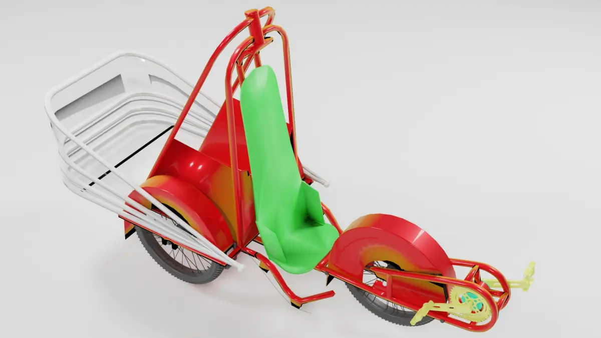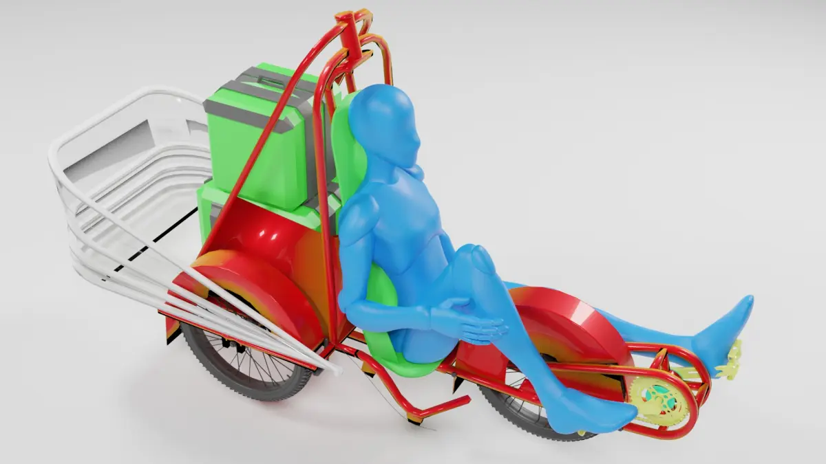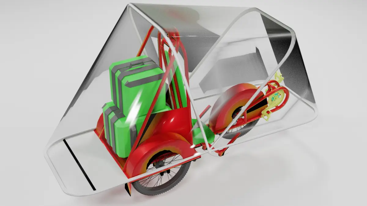 Made by 20x20x20 metal profile, and wheels 20''. Transmission shown by yellow colour. Forvard shield are disassemble. Distance for legs can be changed. Brakes This model was made for curiers of food, do not ride with passengers. Thanks by convertible roof, and rain shields there is possibility travel thru the rain. That protect you from unprofitable waste of time. Or if you such a big fan of traveling, you can made it run by 20" wheel-engine. Also as positive side effect - ABS training during riding.