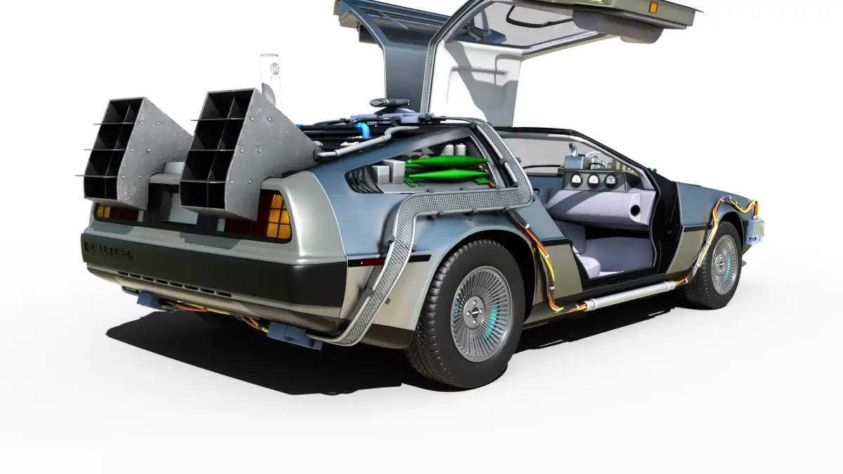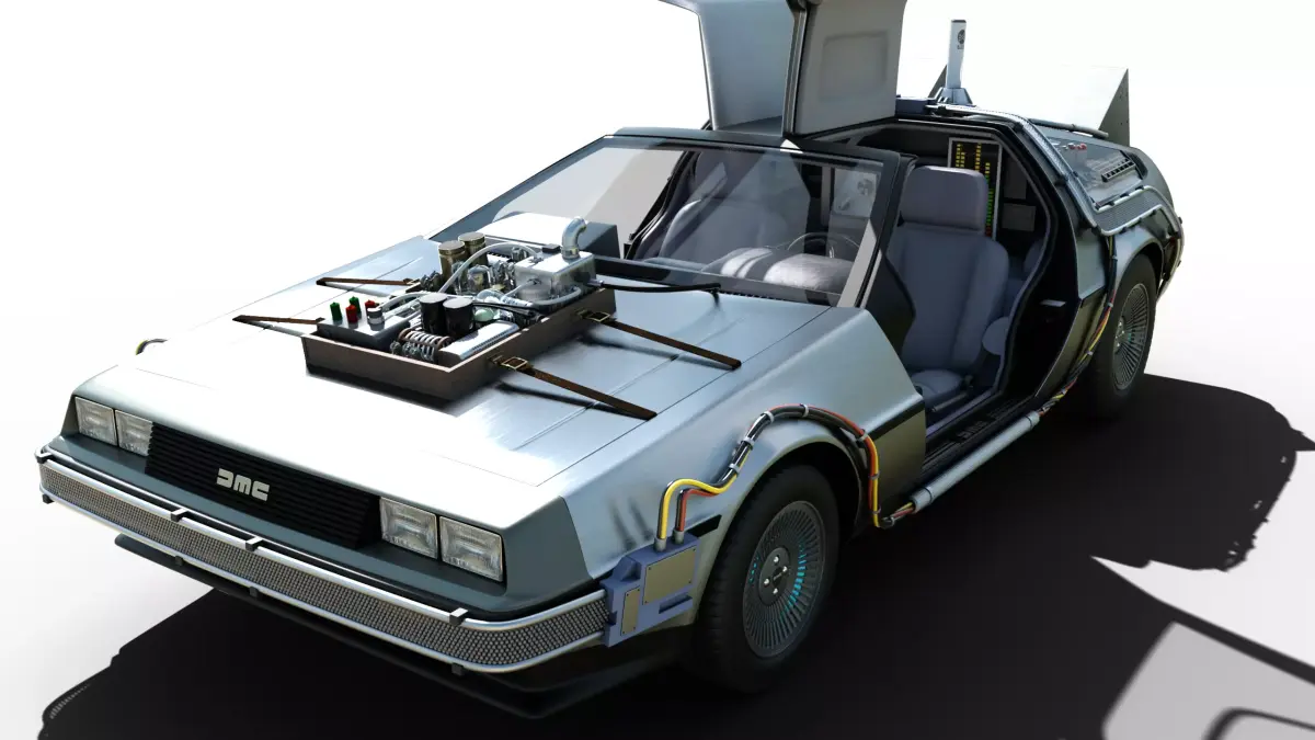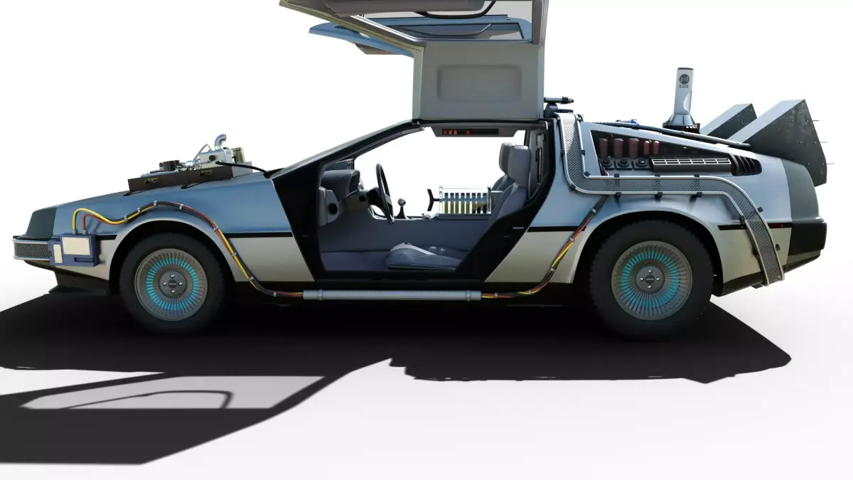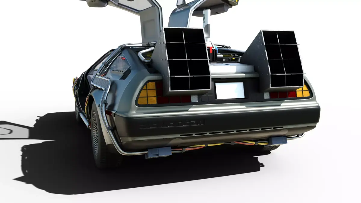 An impressive, hyper-realistic 3D render of the iconic DeLorean DMC-12 modified by Dr. Emmett Brown to become the time machine from the Back to the Future trilogy.