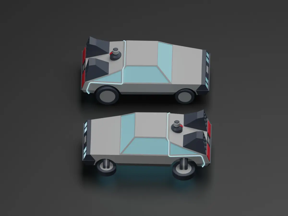 Low-poly 3D model of the iconic DeLorean DMC-12, famous for its appearance in the movie Back to the Future. The scene includes two versions of the car: one on wheels and one flying, representing its futuristic upgrade. This optimized model is perfect for games, VR/AR projects, or real-time applications. Clean topology, efficient UV mapping, and a low polycount ensure excellent performance while preserving the car's legendary design.