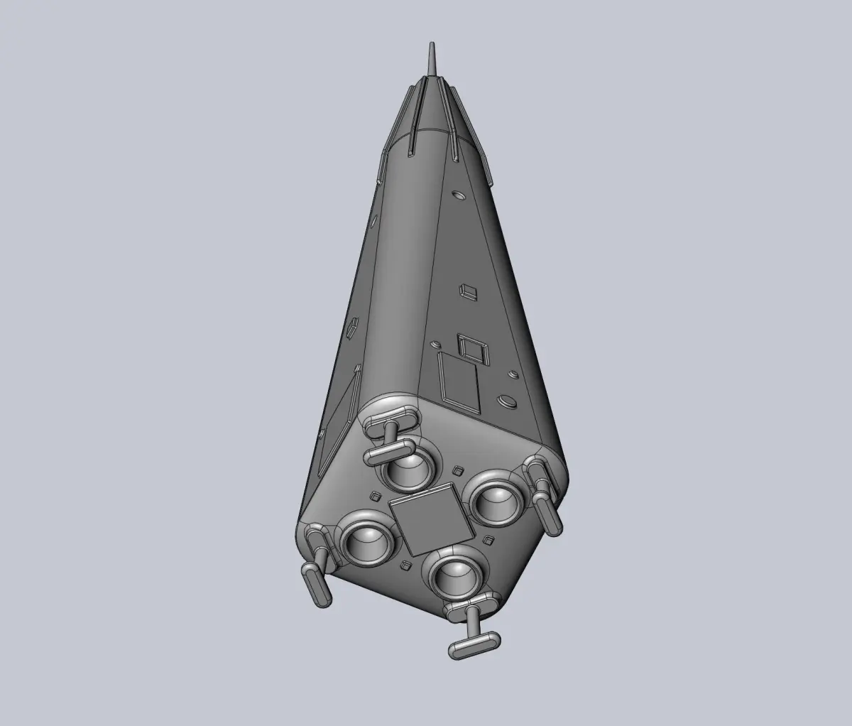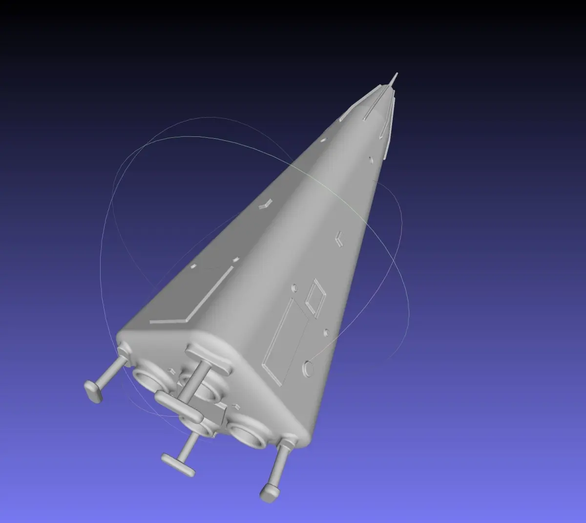 A model of the Delta Clipper Experimental or DC-X built by McDonnell Douglas as a test vehicle for a reusable SSTO concept - it's a vertical hovering and landing test vehicle comparable to the grasshopper Space X built to test the technologies for the Falcon 9 although the intended final version would have been a reusable SSTO rocketthe model is full scale but designed to be scaled down about 1/100 and printed easily