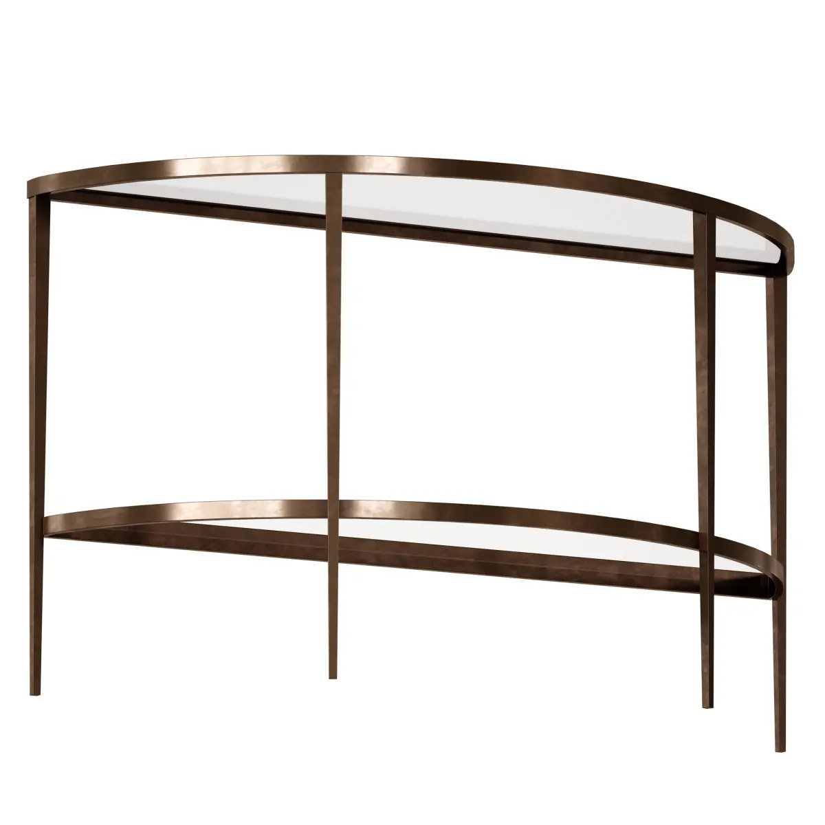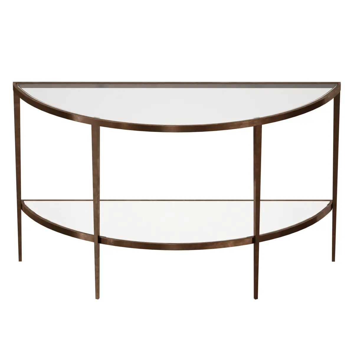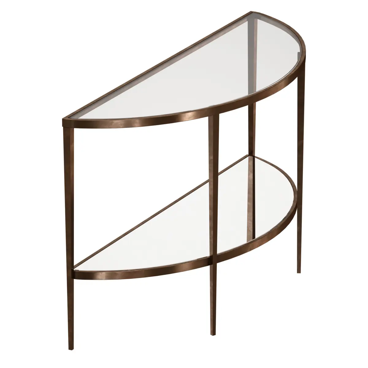Semi-circular, oval console table in the Art Deco style. A metal base of warm bronze shades frames the table top made of transparent glass. The lower shelf is made of a mirror.