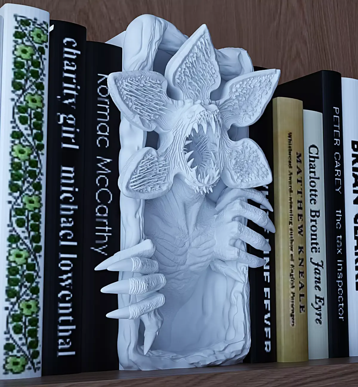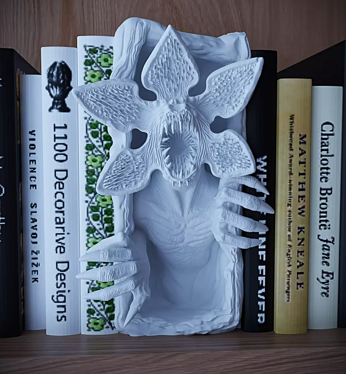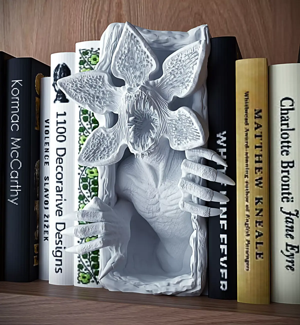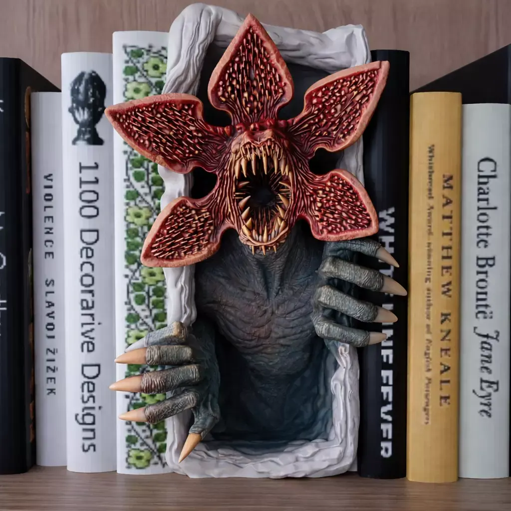 Bring the Upside Down straight into your bookshelf with this striking Demogorgon Book Nook, inspired by the iconic monster from the Netflix series Stranger Things.Designed to fit seamlessly between books, this piece creates the illusion of the Demogorgon breaking through another dimension, transforming any shelf into a cinematic scene.